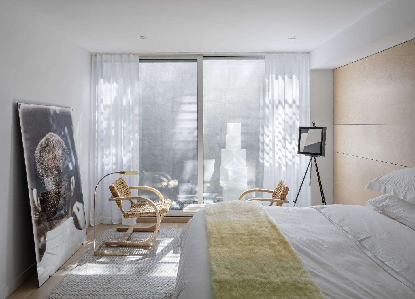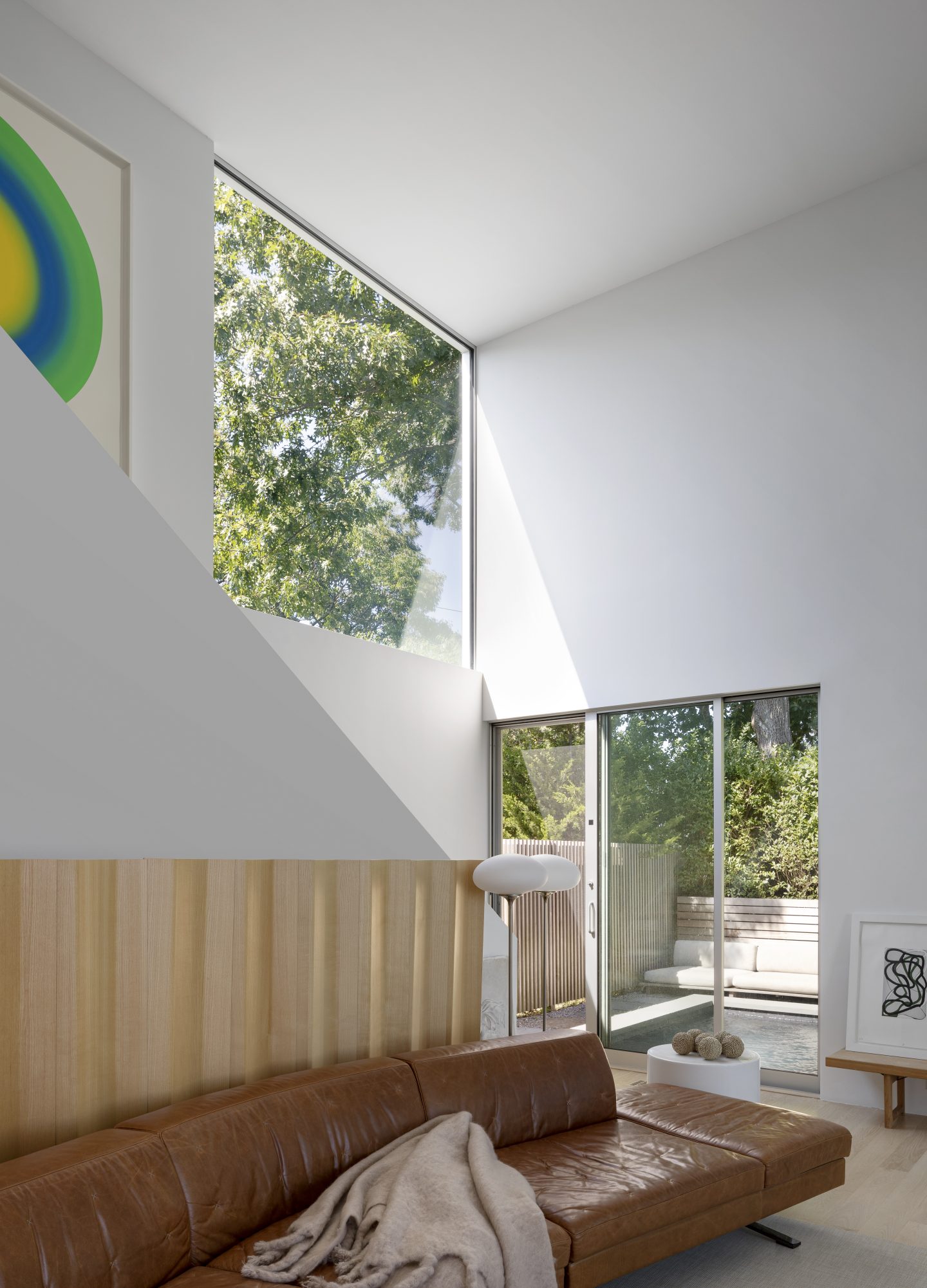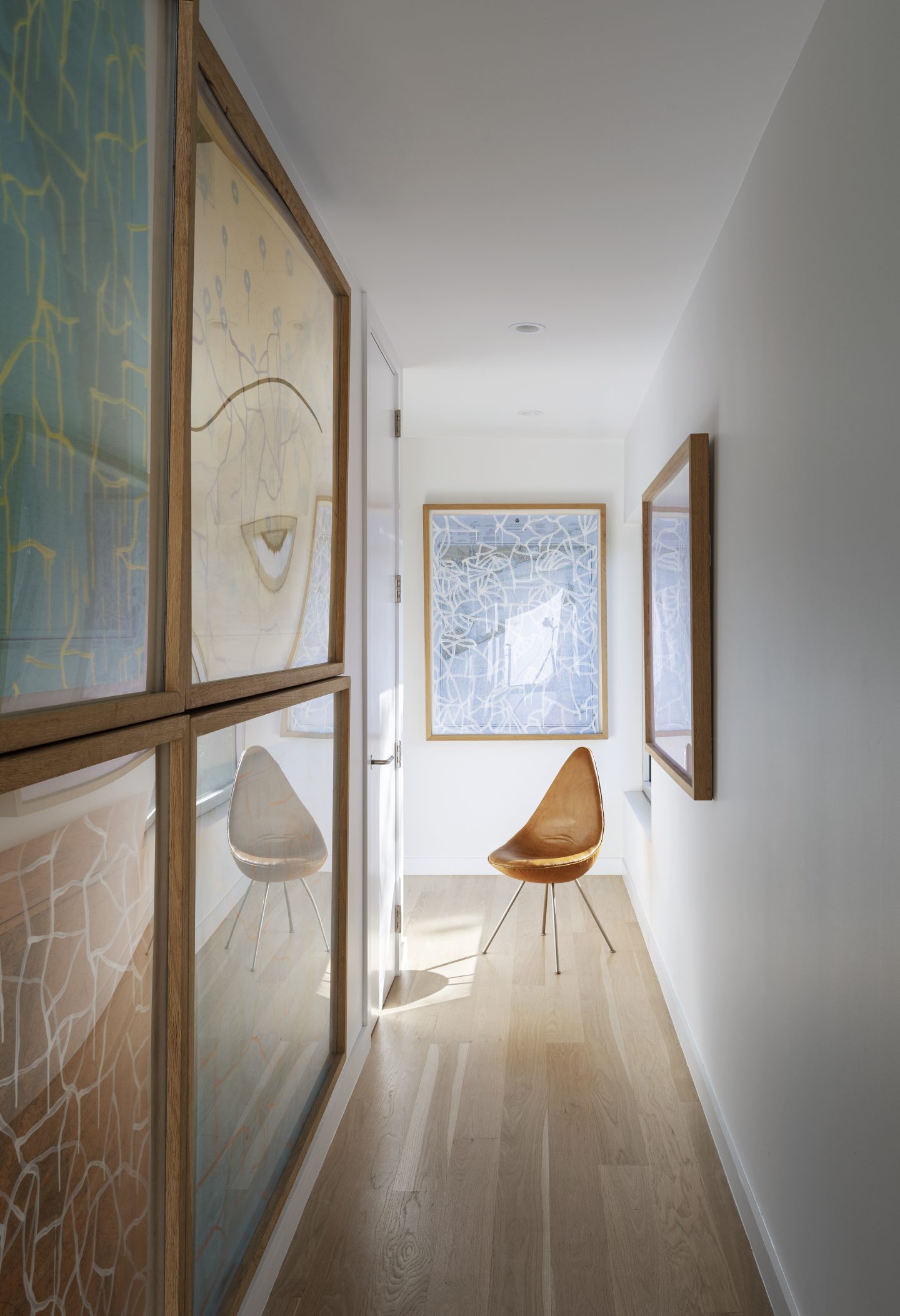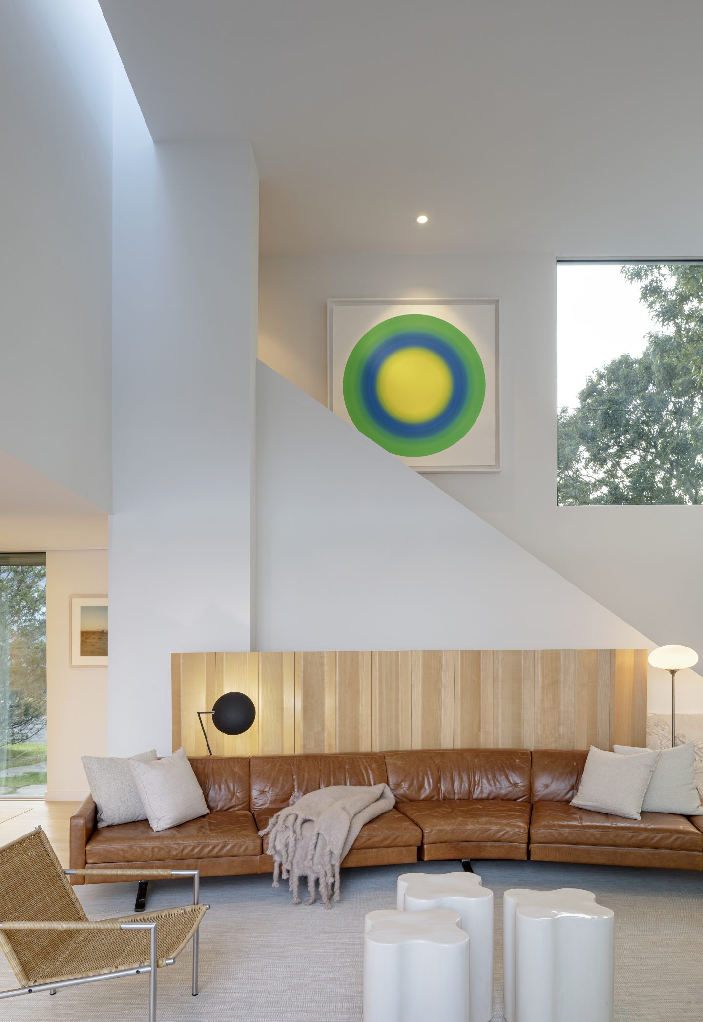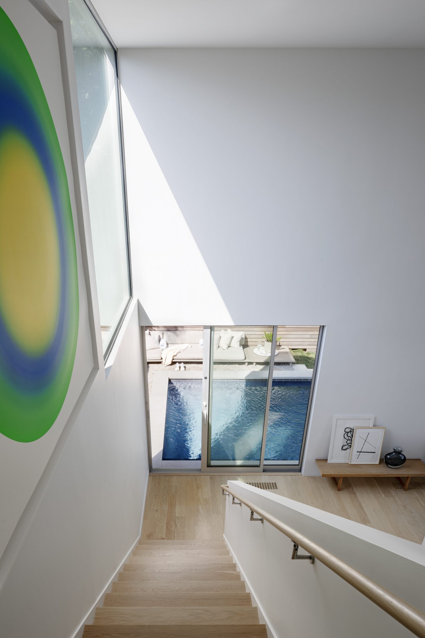 For example, as the elegant but simple maple millwork throughout the house grounds the experience, the freestanding Poul Kjaerholm wooden screen becomes an animated link to the wood pool enclosure and stripped down wall to the water. In the west stair overlooking the daily sunset, Ugo Rondinone’s brilliant green and yellow sun unifies the first and second floor levels just as it unifies the beginning and the end of the day.