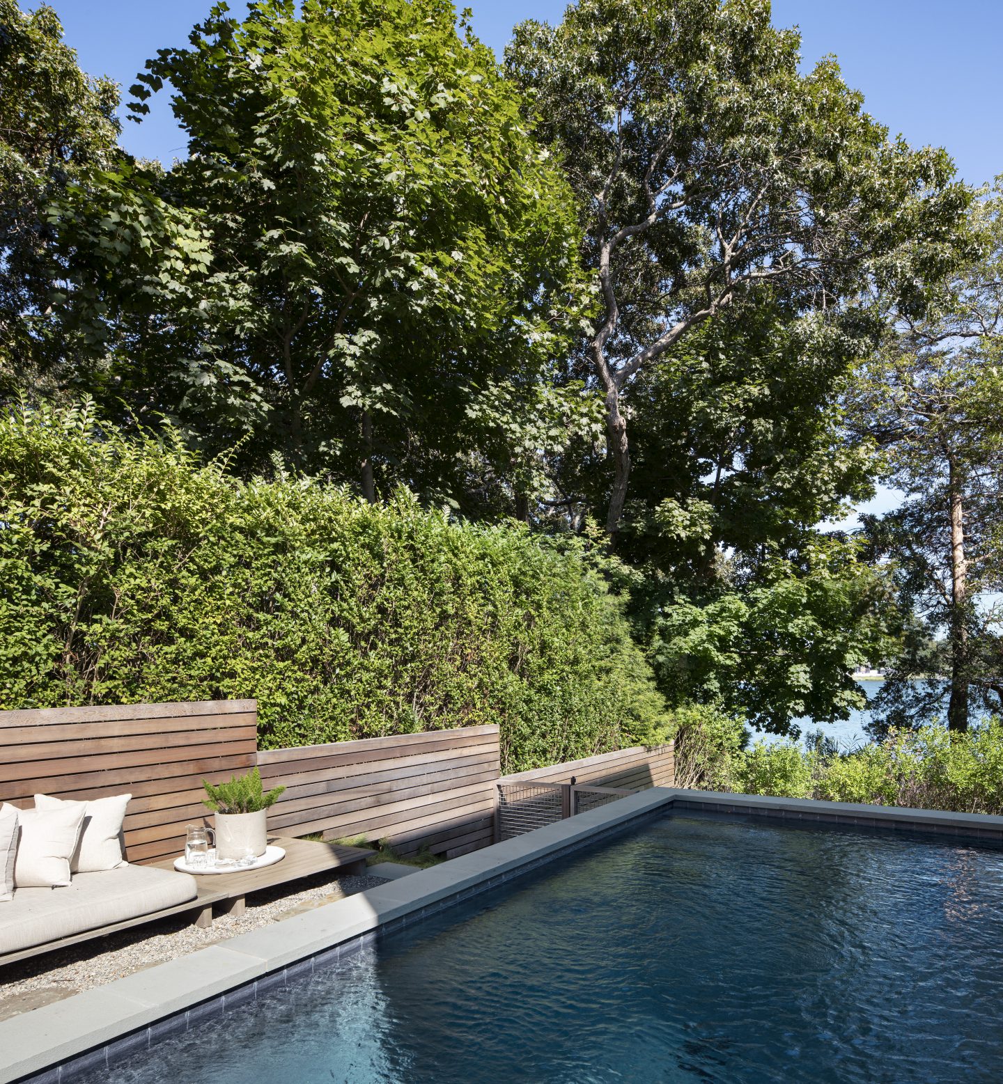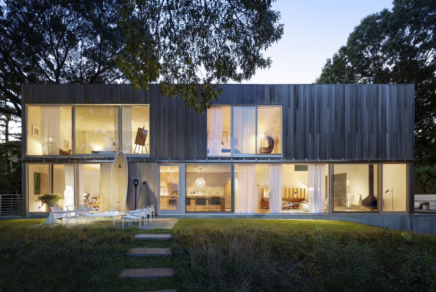The landscaping on the waterside elevation is a projected reflection of the back façade creating a plinth or podium for the house and gently grades into the site, unifying architecture, interior and context.