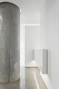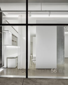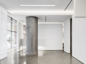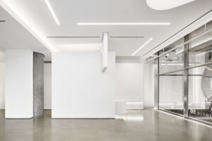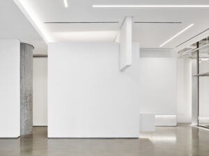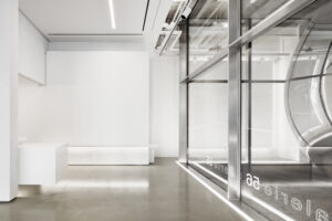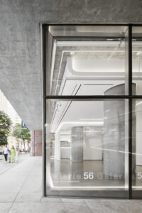 At the center of Manhattan’s TriBeCa neighborhood, Galerie56 is nestled into the street-level base of the iconic 56 Leonard – designed by acclaimed architects Herzog & de Meuron, and flanked by the new landmark sculpture by Anish Kapoor. The gallery space at 56 Leonard is conceived as opening its arms to the largest city, the street, and community at large. It reflects our deeply American values of openness, transparency, and celebration of all cultures, welcoming all international cultures to be part of a democratic discourse accessible to all. The art and architectural elements exhibited at the gallery are reflected by the Anish Kapoor sculpture.The gallery space is illuminated 24 hours, thus illuminating the sculpture once the sun goes down, allowing the art to live together in a symbiotic relationship. Through establishing a dialogue with Anish Kapoor’s sculpture, the space not only acts as a physical node on Church Street but acts as a larger metaphorical node in the vast network of artists around the world. The architecture of the space completes at the base, reflecting the building high above the city, and makes a deconstructed interpretation of its intersecting volumes by translating them into a series of intersecting planes within the space.