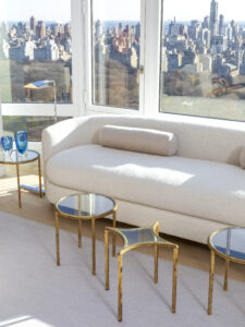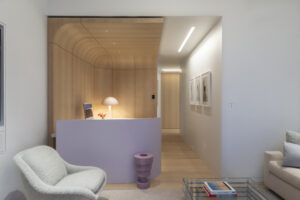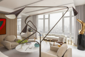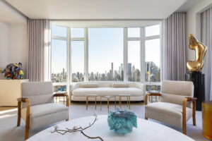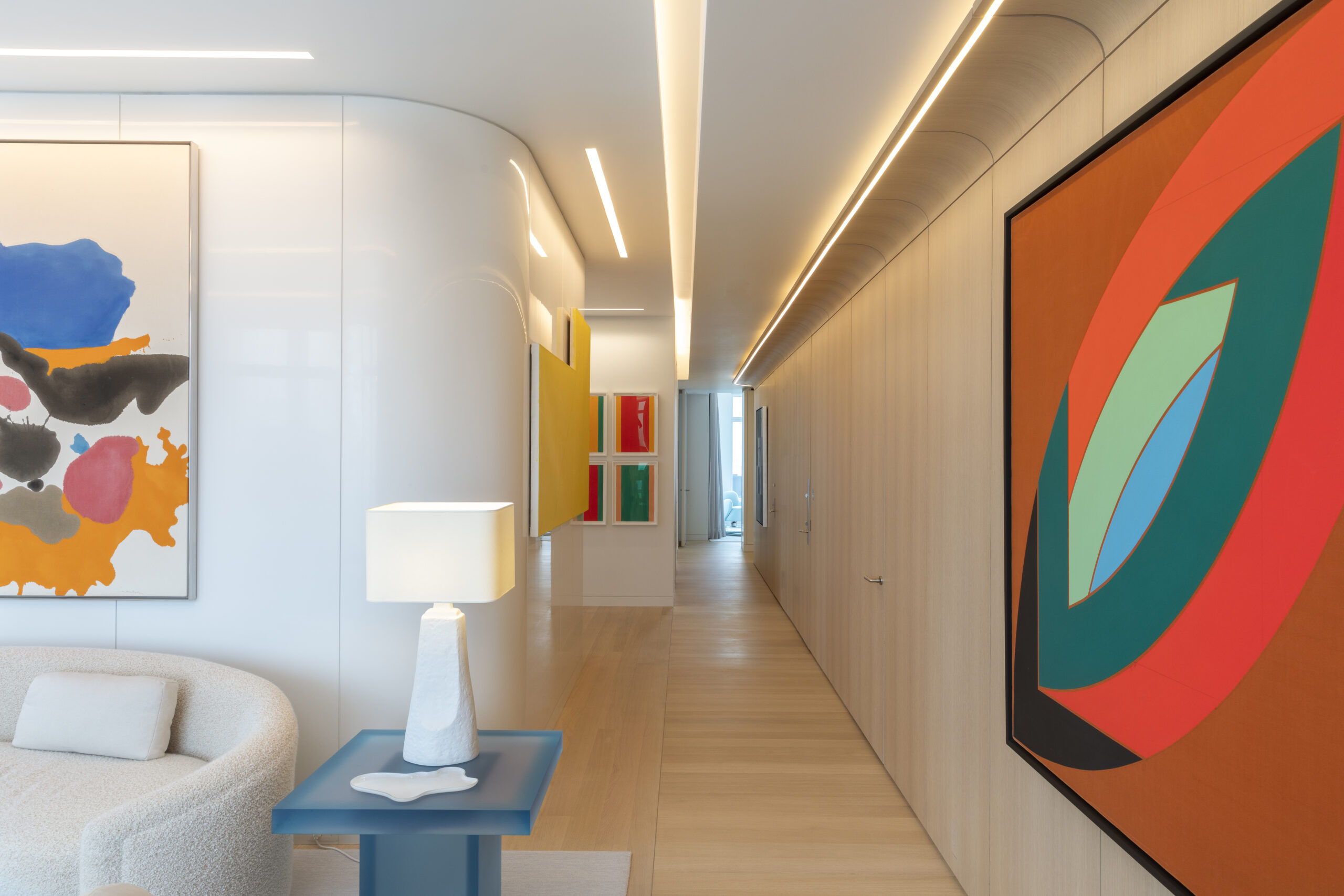By creating a liberated sequence of axial spaces, the design allows for uninterrupted sightlines, enabling views across the unit—from Central Park to the Hudson River. The tools used to achieve this include an extensive art collection and a continuous wood datum art wall that incorporates picture hangings and integrated lighting, extending from floor to ceiling. This feature enhances the perception of ceiling height, making the space feel even more expansive.