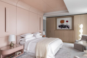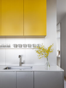 The primary bedroom suite, with its rose-colored onyx and sunset-hued furnishings, mirrors the colors of sunrise and sunset over the park. On the easternmost side, the kitchen embraces the morning light with a burst of yellow, reflecting the sun as it rises over the river.