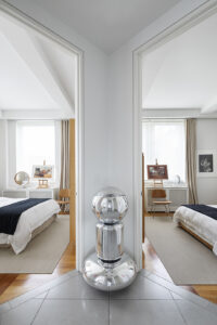 The structural beam and concrete bay system in the public and private areas is expressed in the ceiling and reflected in the oak and cherry wood floor. A natural palate of plaster, stainless steel, wood, white structural glass and the custom designed furniture, upholstery, lighting, rugs and rubberized latex mats have a dialog with a rare collection of furniture and objects by 20th-century architects, ceramists, sculptors, and artists.