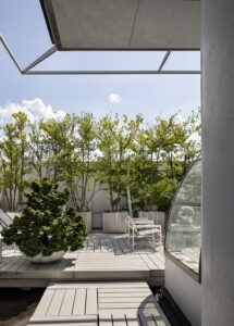 The pure geometric forms are comprised of a rotunda and glass cage rising through the ceiling. The curved glass vault frees the rotunda as it comes through the roof. Punches in the rotunda reveal the shape of the double helix stainless steel and concrete stair. The stair leads to a sitting room with unobstructed views north and south oriented semi-enclosed birch tree roof garden. The south gardens parapet walls are punched on the east and west façades to provided framed views from river to river. In contrast, the north view through the water tower is completely open and urban with the neighboring buildings’ water towers lit from the addition. The roof addition sitting room is part water tower, periscope, and observation tower crowned by a metal bris-soeil similar to the crown of the Statue of Liberty.