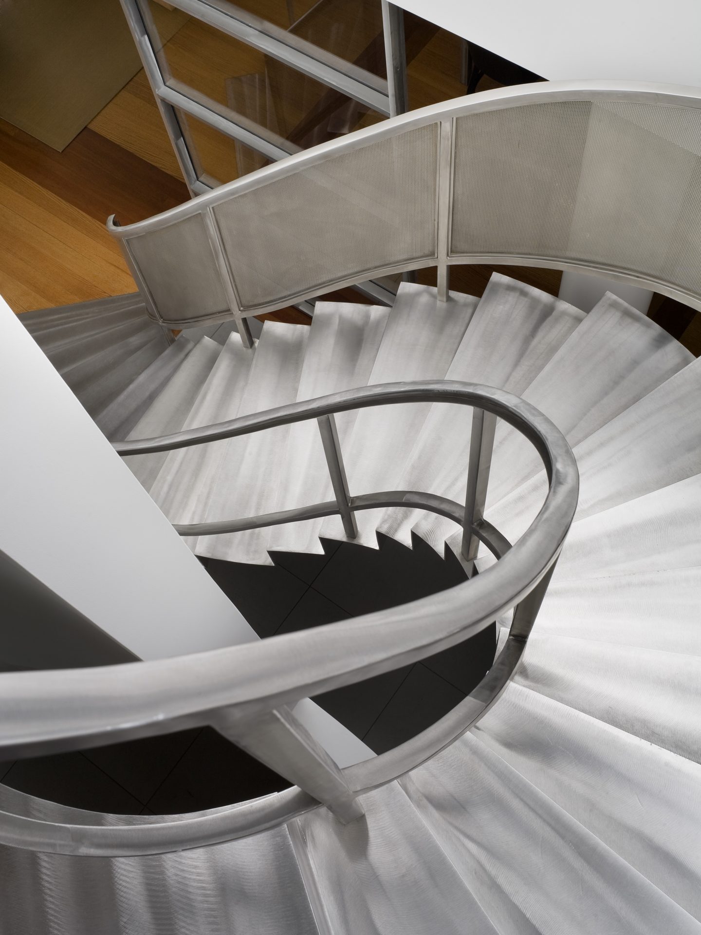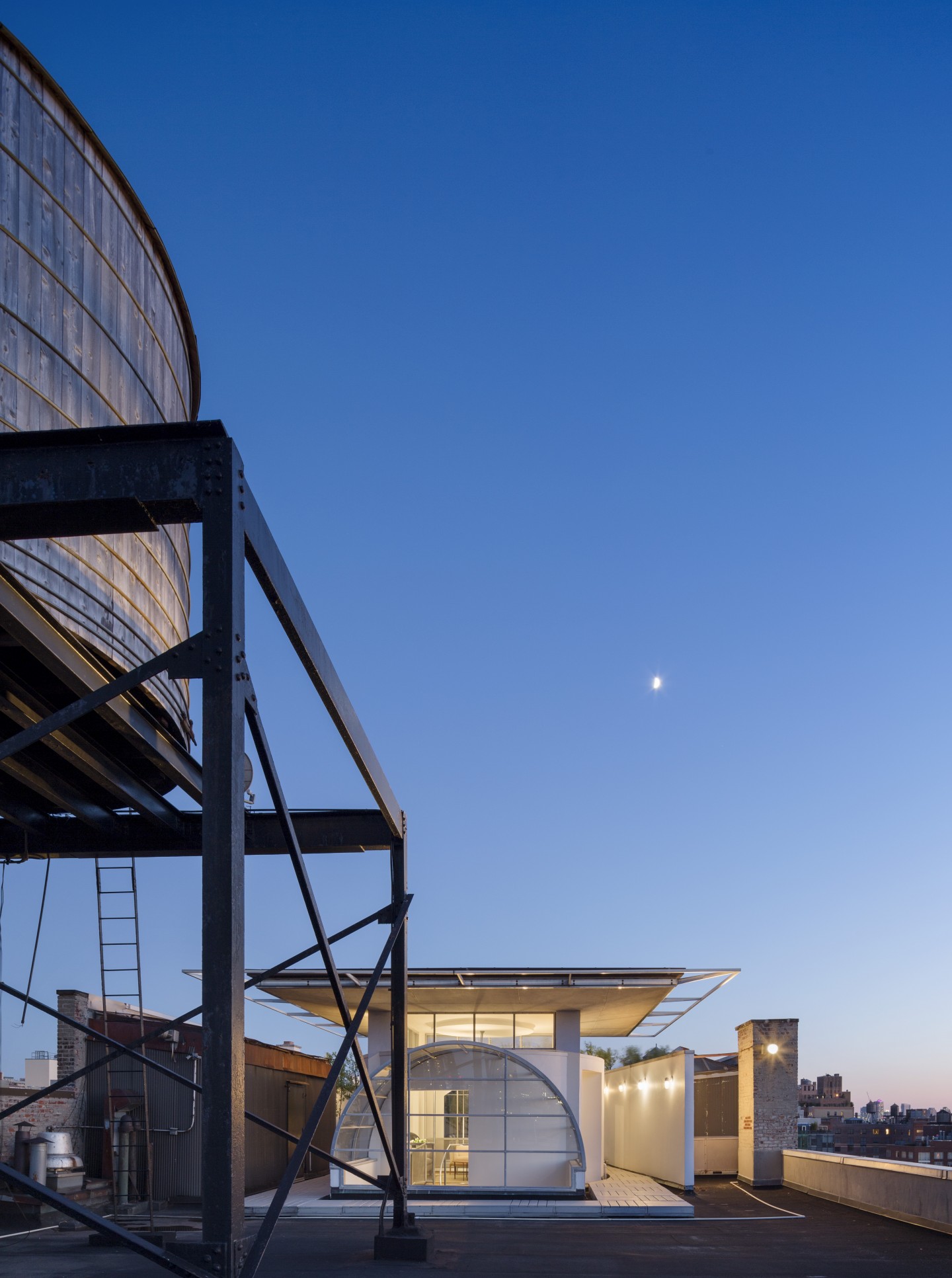 The pure geometric forms are comprised of a rotunda and glass cage rising through the ceiling. The curved glass vault frees the rotunda as it comes through the roof. Punches in the rotunda reveal the shape of the double helix stainless steel and concrete stair. The stair leads to a sitting room with unobstructed views north and south oriented semi-enclosed birch tree roof garden. The south gardens parapet walls are punched on the east and west façades to provided framed views from river to river. In contrast, the north view through the water tower is completely open and urban with the neighboring buildings’ water towers lit from the addition. The roof addition sitting room is part water tower, periscope, and observation tower crowned by a metal bris-soeil similar to the crown of the Statue of Liberty.