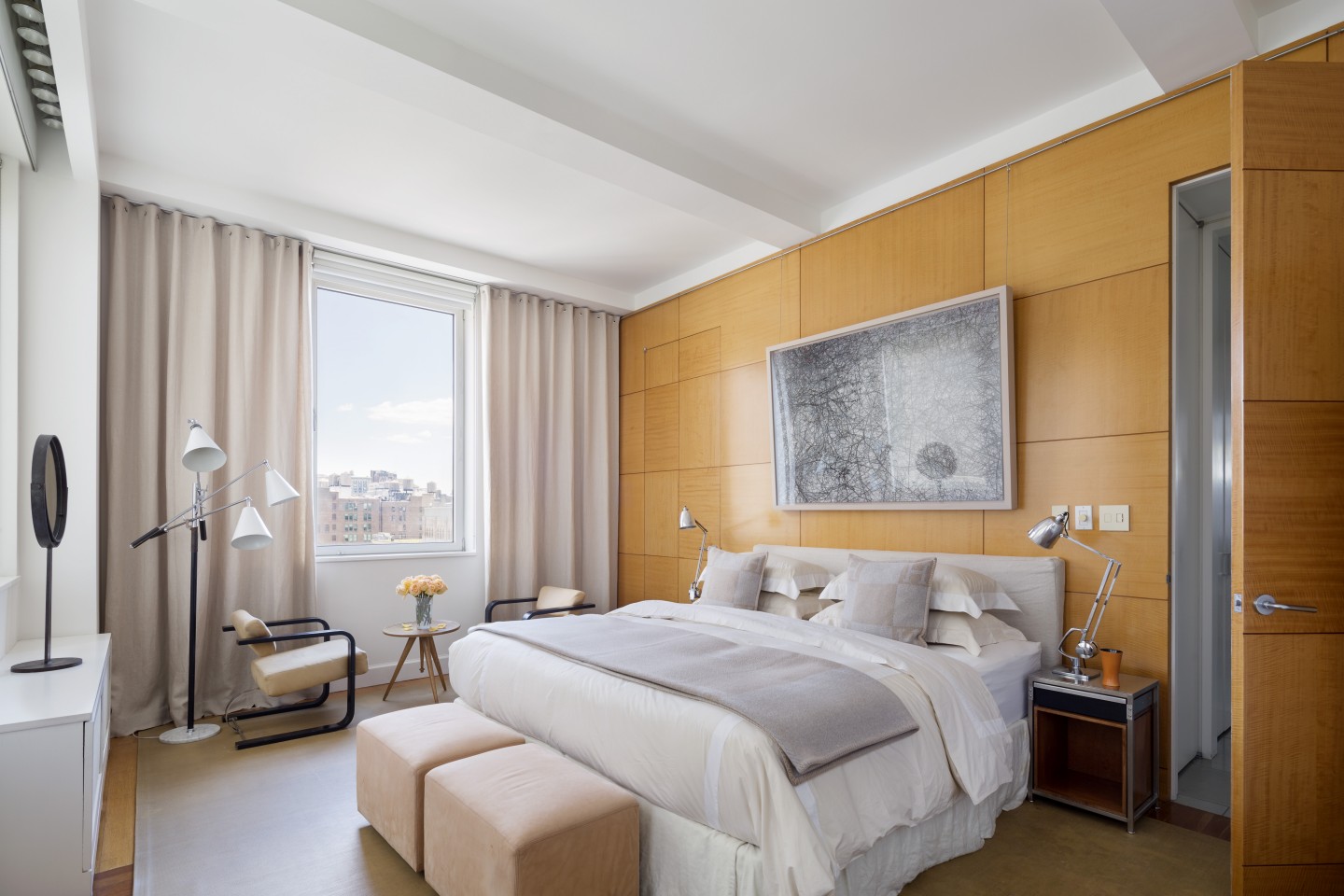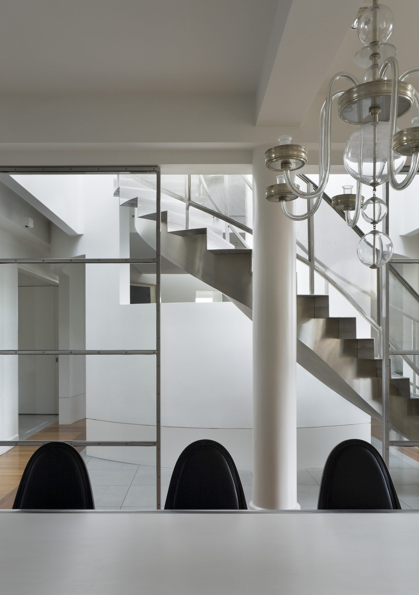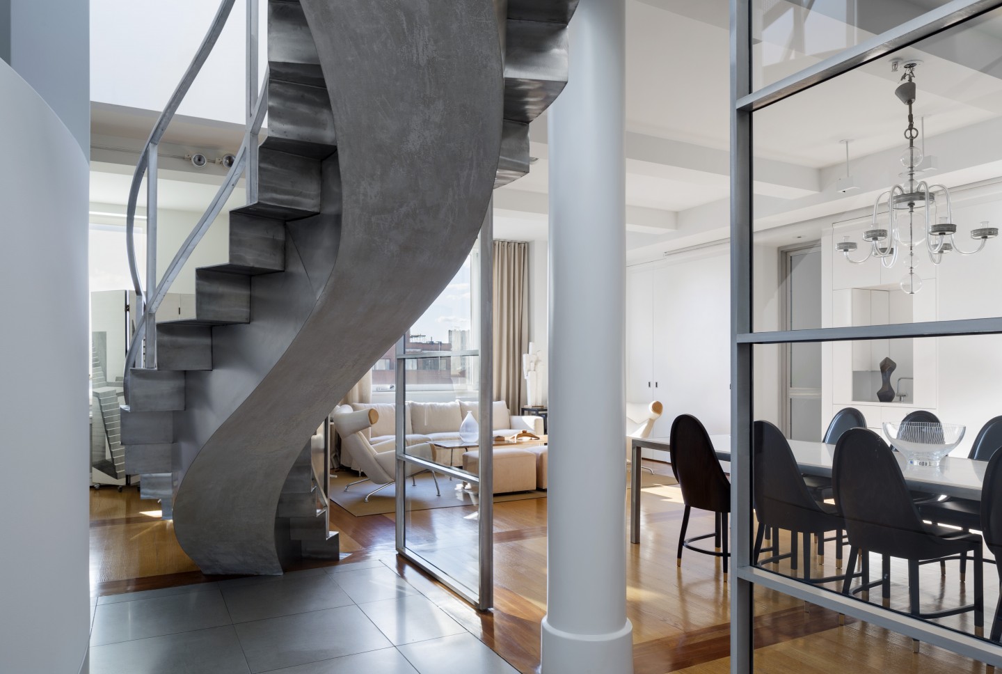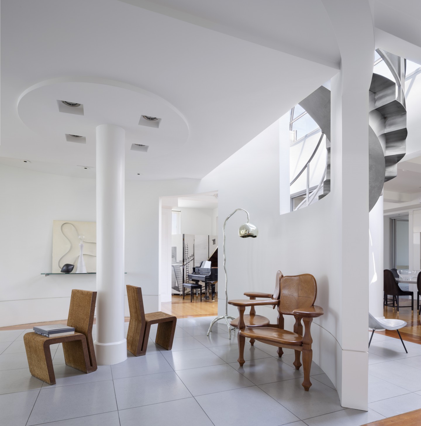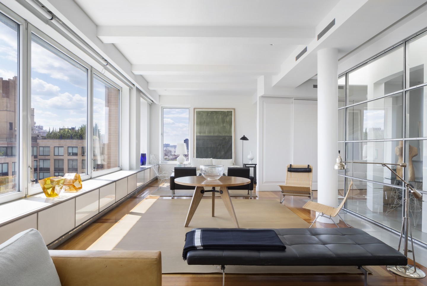 The structural beam and concrete bay system in the public and private areas is expressed in the ceiling and reflected in the oak and cherry wood floor. A natural palate of plaster, stainless steel, wood, white structural glass and the custom designed furniture, upholstery, lighting, rugs and rubberized latex mats have a dialog with a rare collection of furniture and objects by 20th-century architects, ceramists, sculptors, and artists.