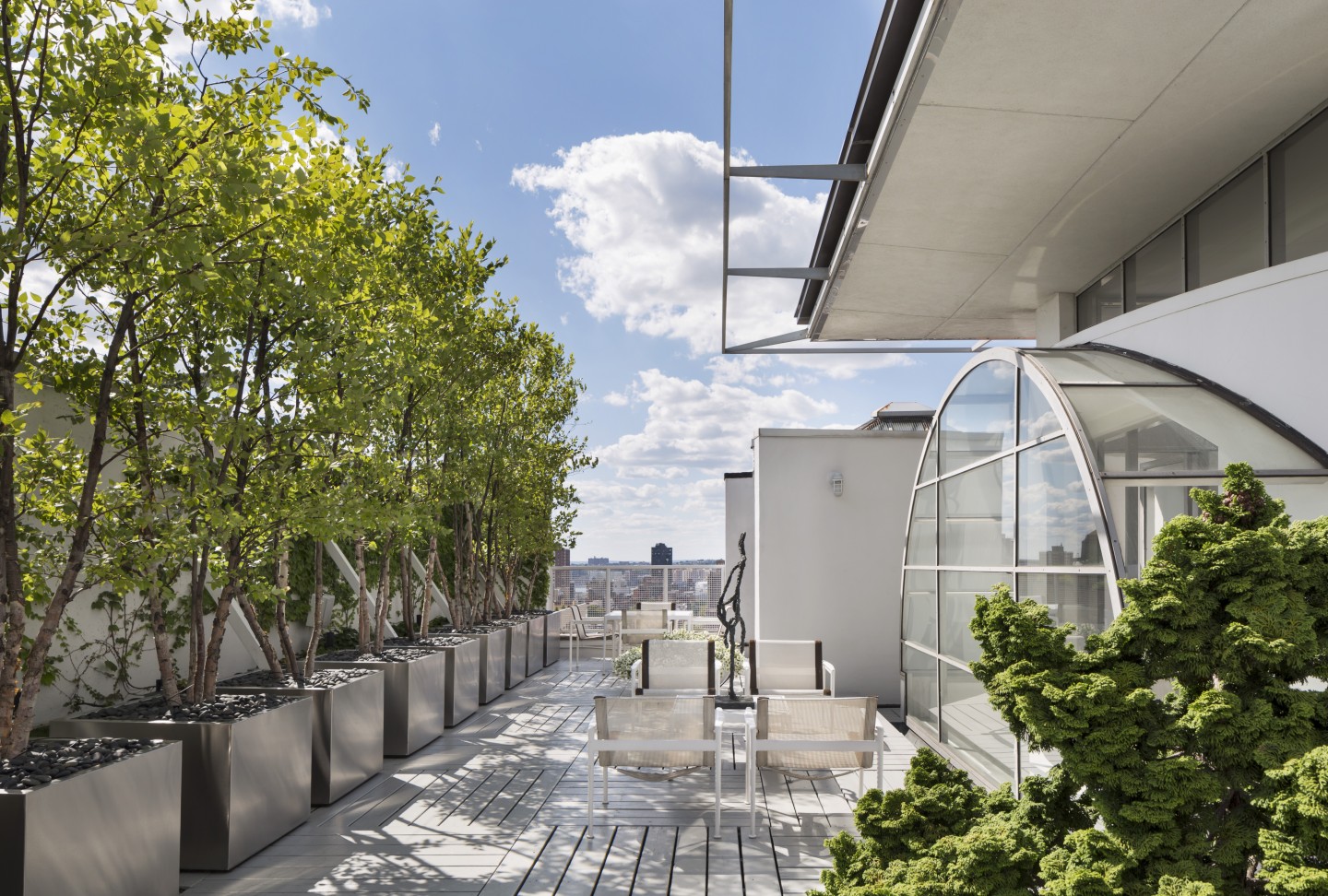 In a 42-foot by an 85-foot top floor of a former manufacturing building, design a space and rooftop structure exploiting the potential 4 façade exposure and roof access. Integrate the city, the architecture, and the interior design and incorporate a collection of furniture and decorative arts by 20th-century artists and architects.