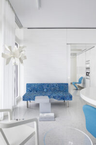 The vocabulary of all the spaces including bedrooms, screening room, kitchen, dining room, and living room, evokes the contextual imagery of South Beach itself, with its cabanas, sun louvers, beach balls, and the palettes of sun and sea. The backdrop of the mast-like form is composed of watercolor blue glass panels which integrate with the sky beyond, while the terrazzo floors mimic the pattern of the shifting sands.