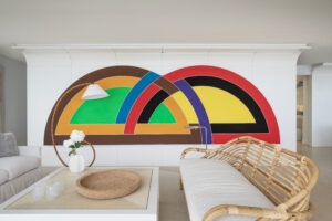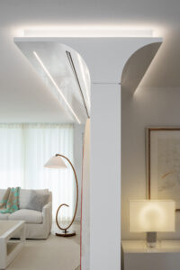 In a small-scale postwar oceanfront building with challenging ceiling heights, we created a more open plan to celebrate views of the sea. This was achieved with a series of strategically placed, larger-scale walls to accommodate the owner’s impressive modernist art collection. As the low ceiling heights posed a challenge to incorporate lighting and protection from the sun, a new millwork wall containing lighting and motorized screens curves before it intersects with the ceiling providing a place for housing the screens without lowering the ceiling. Architecture, art, and design are seamlessly integrated.