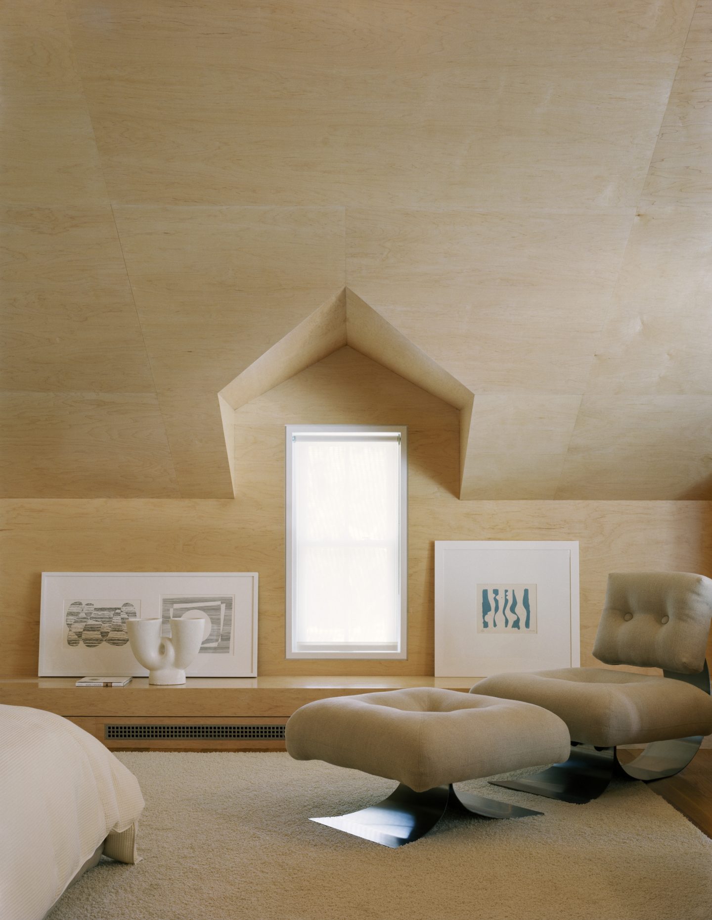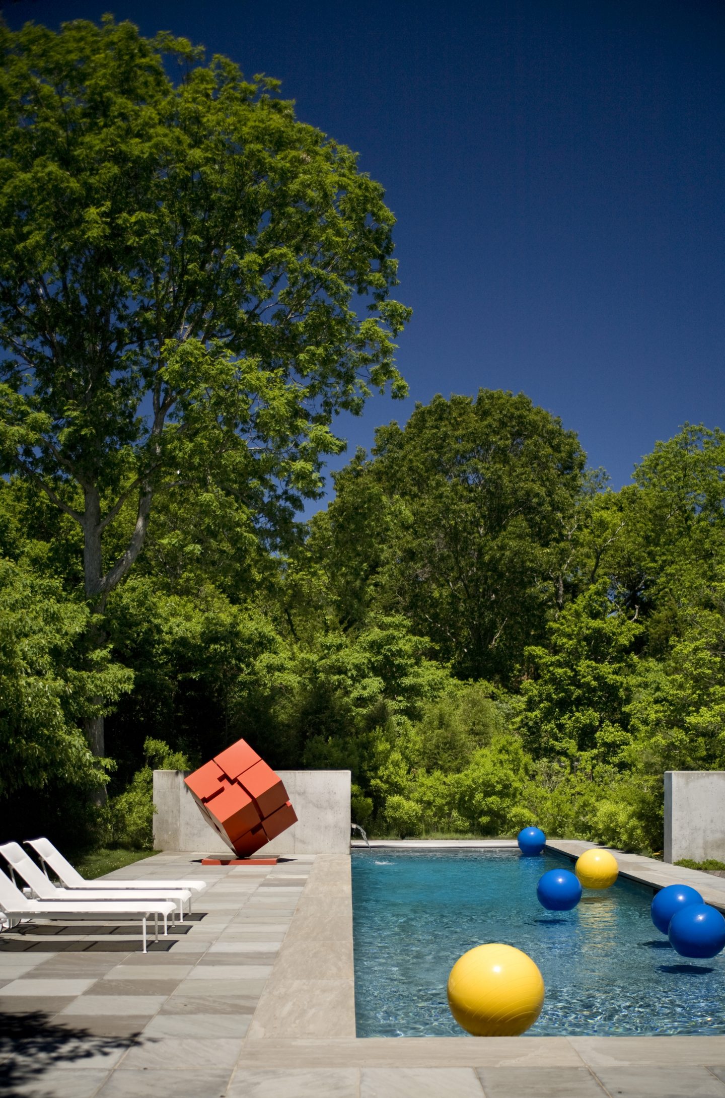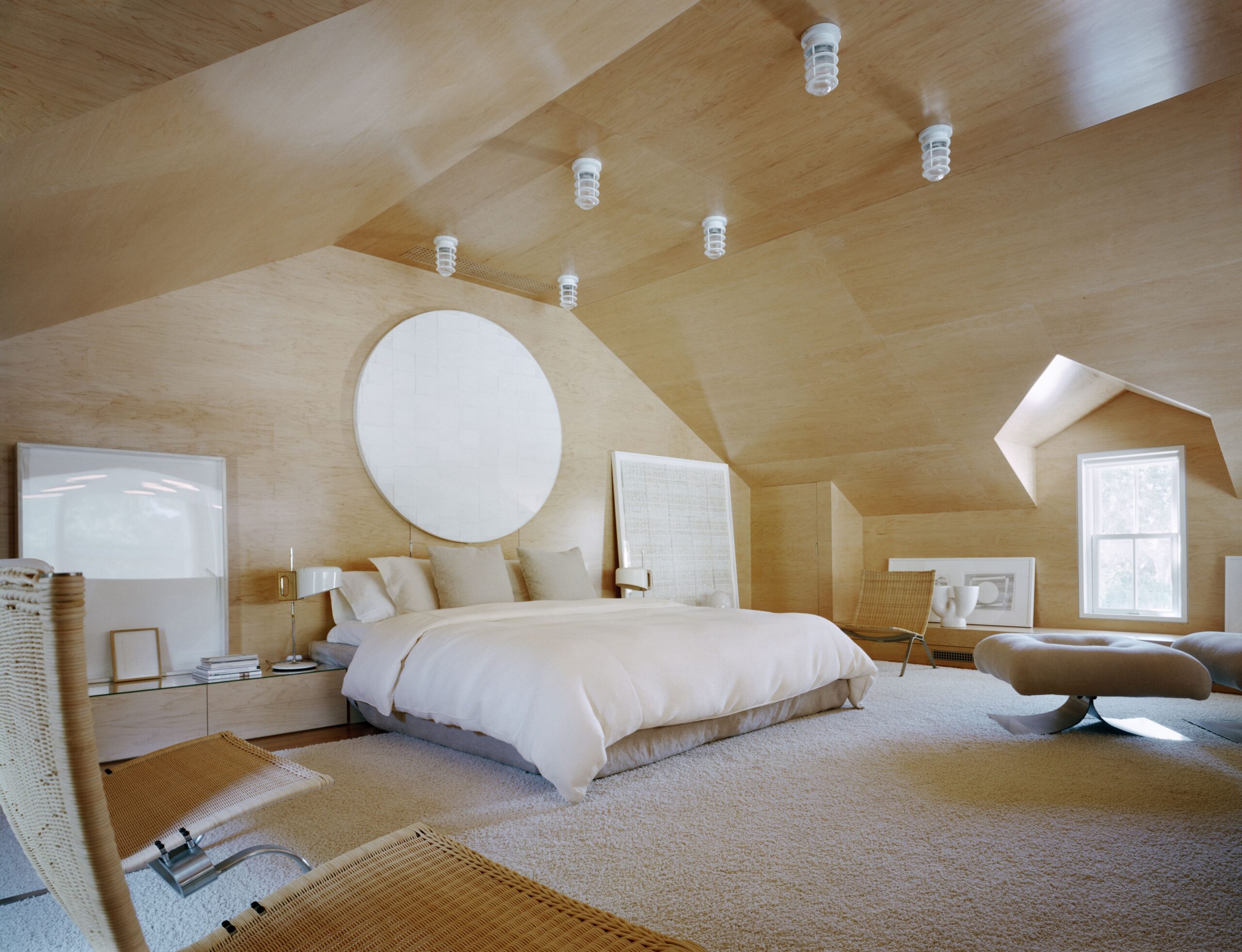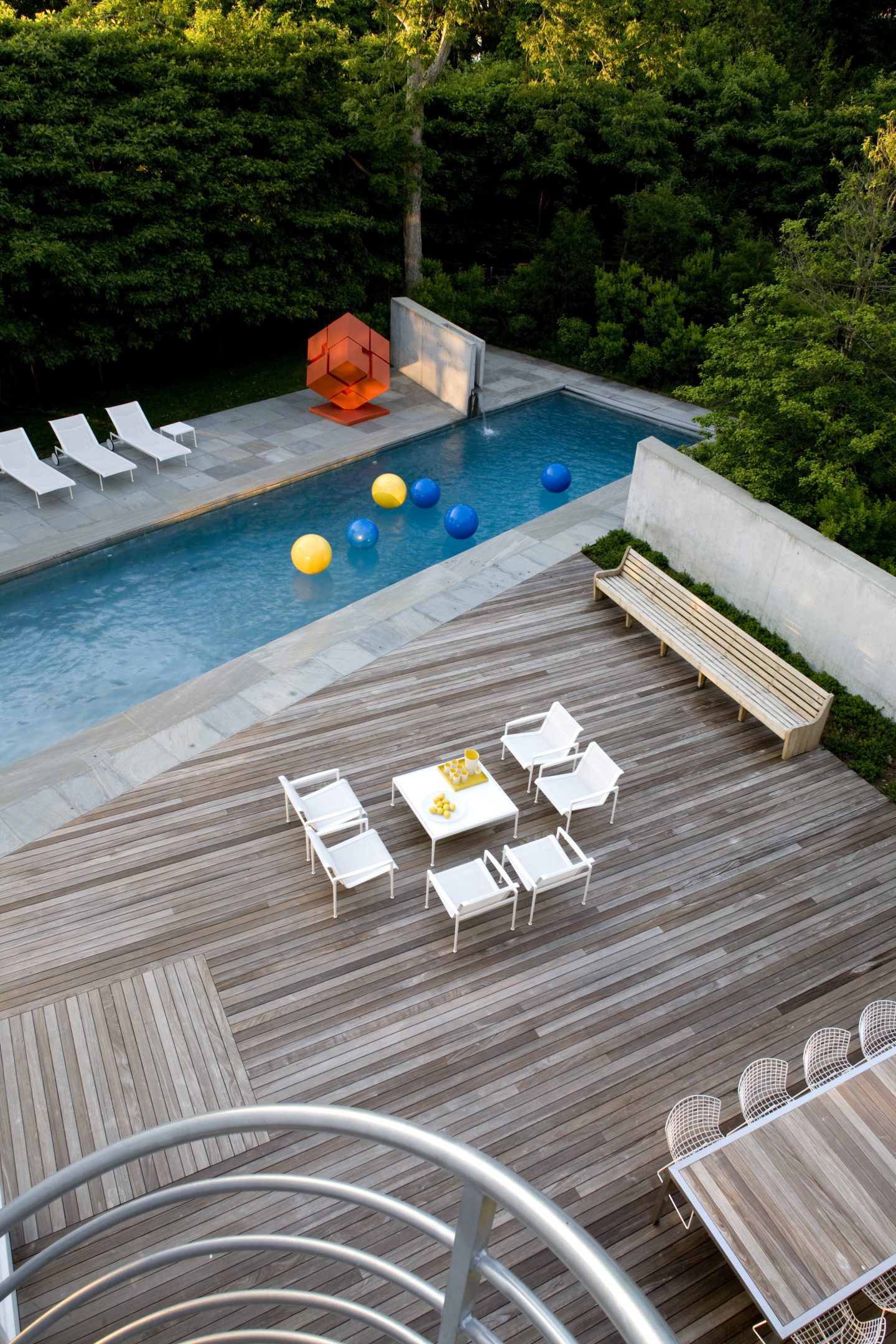 Both interior and exterior furnishings become abstract shapes in a sculpture garden. Some of the same furniture is used inside and outside, an orange spinning sculptural cube generates the color of the seating that surrounds the round Poul Kjaerholm dining table. The yellow rug that hovers on the floor is like a child’s balloon and anchors the two Italian chairs that are placed back to back. Isamu Nogucihi’s Wind Chimes galvanized tin sculpture and the marine blue porpoise-shaped cantilevered Colani chaise are the interior sculptures. A two-story proscenium masks the stepped down massing of the gables beyond and is a cubist composition of layers of light, wooden planes and glass. The bedroom, bathroom, stair and all storage are constructed of maple with all furnishings wood, wicker and linen. The upstairs bedroom becomes a maple tree house that faces the view of the sculpture garden, swimming pool, outdoor room and creek.