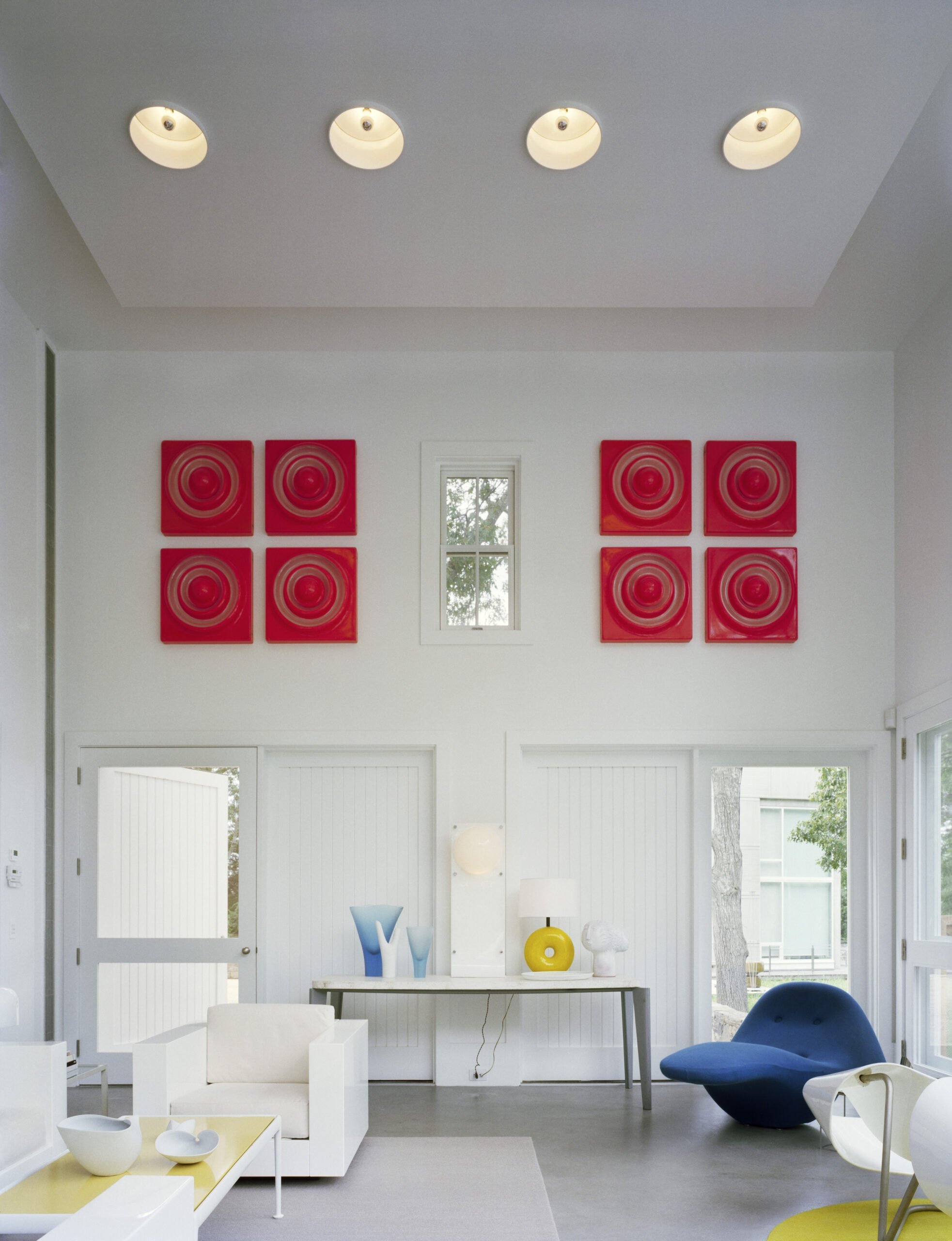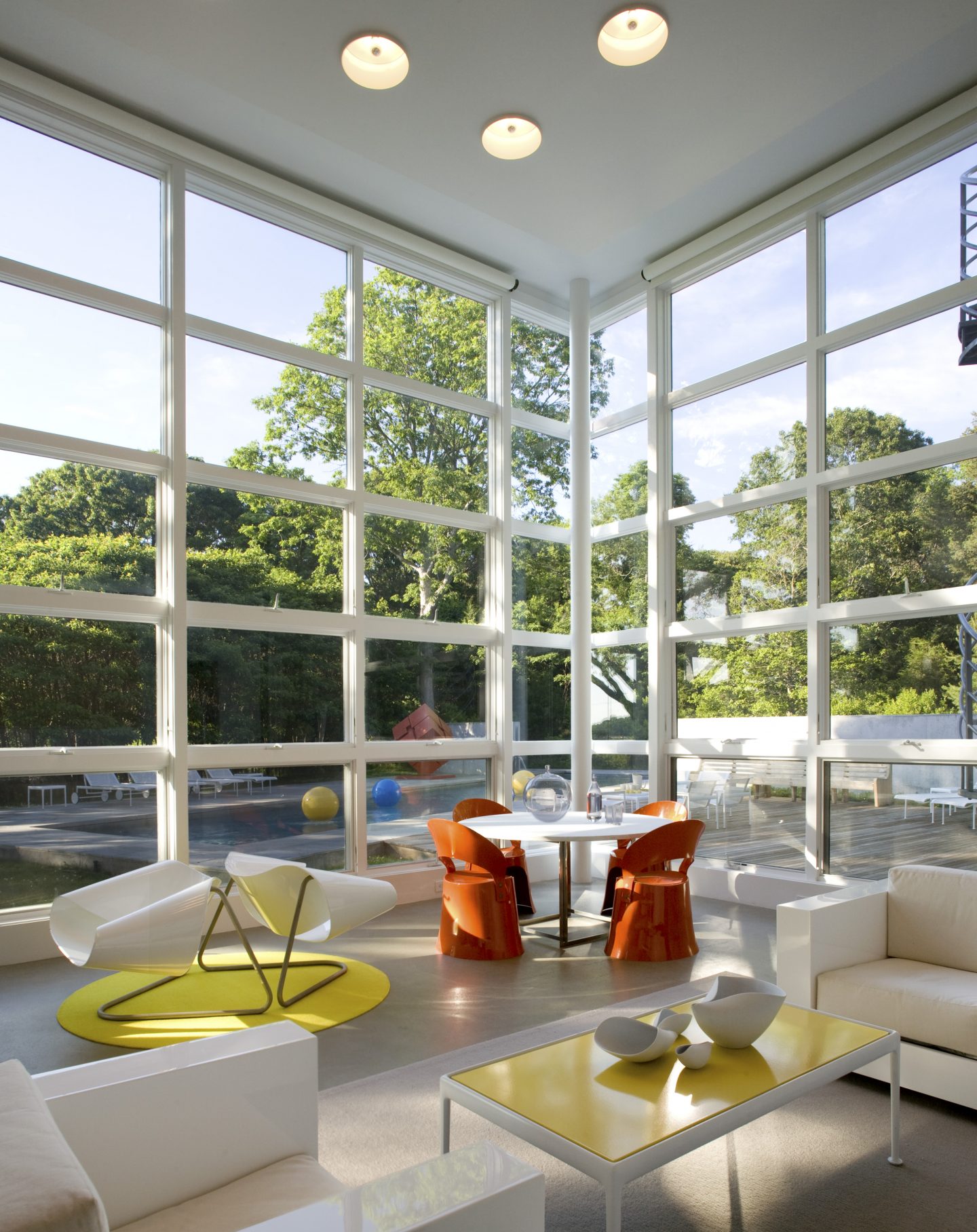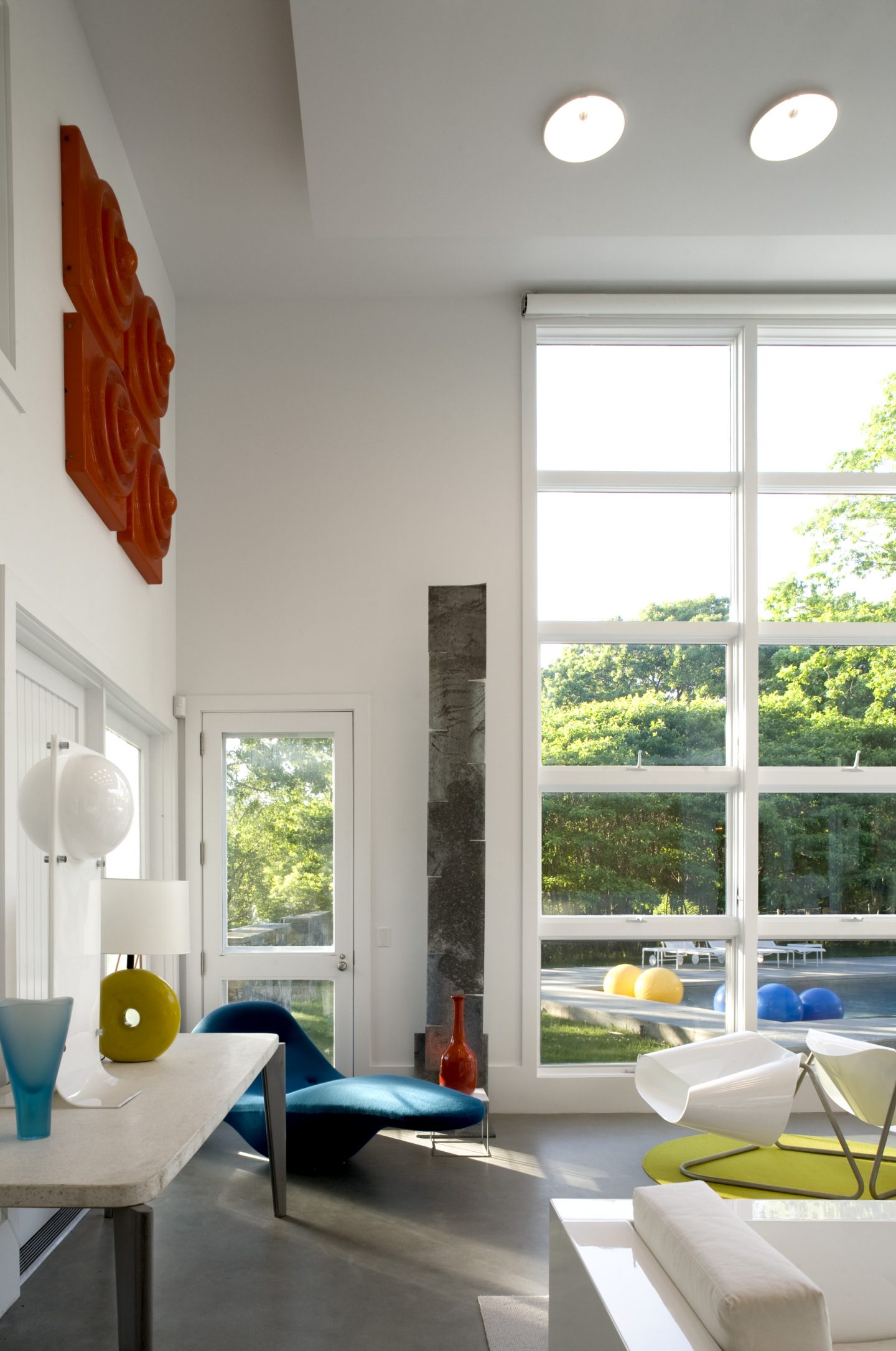 A double-height space is integrated with the pool, sculpture garden and water view. Furnishings, both inside and outside, are comprised of Bauhaus building blocks that blur the lines between exterior and interior, sculpture and furniture. The concrete floor is similar in palette to the stone and wood surfacing used as the exterior paving. A concrete colored rug and a floating ceiling of levitating portholes define the main seating area in the two-story living space. Its shapes are echoed in the orange plastic wall lights by Vernor Panton. Those round shapes are echoed in a set of 8 orange Vernor Panton wall light sculptures as well as the yellow rug that anchors two Italian chairs set back to back.
