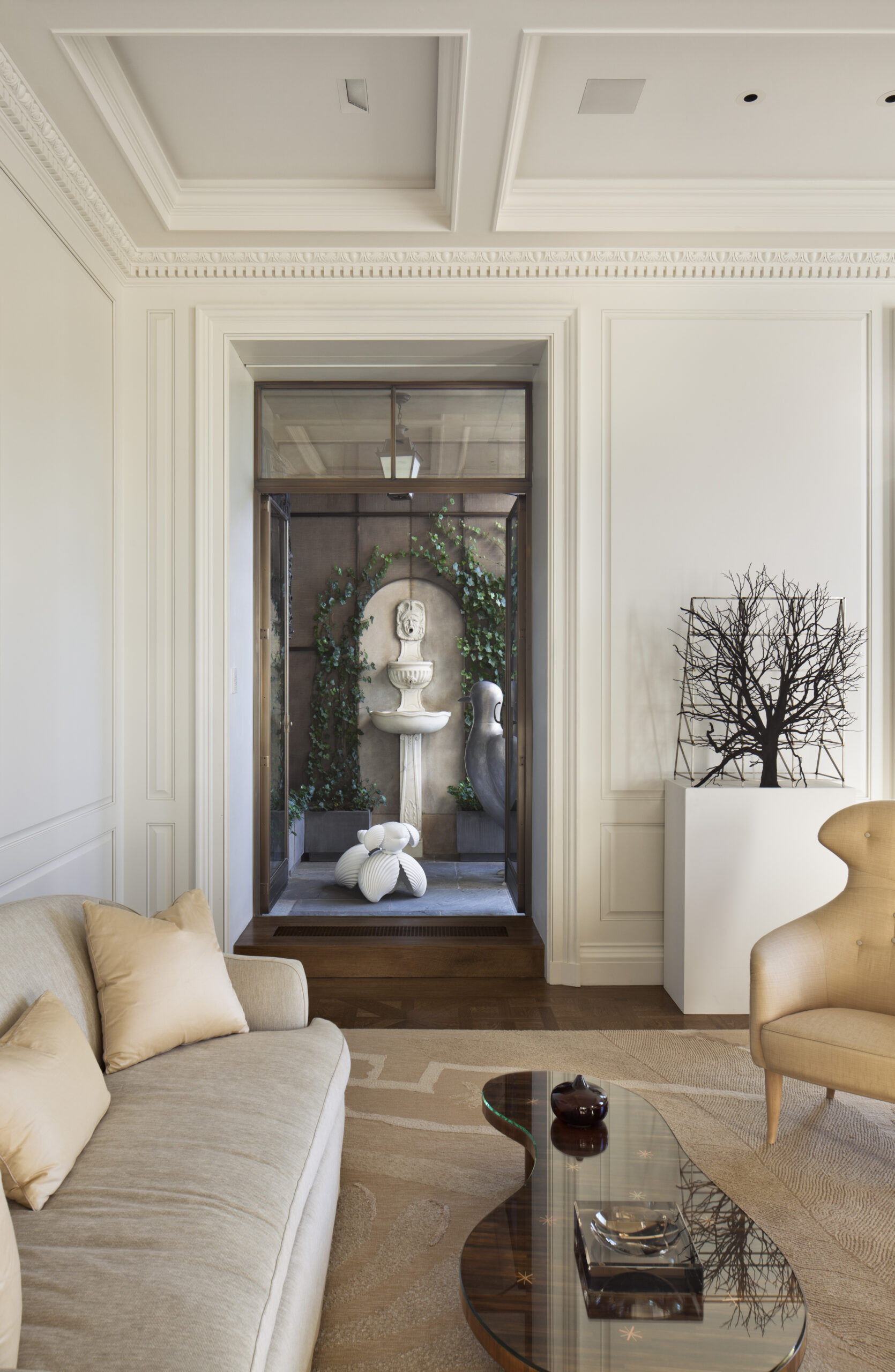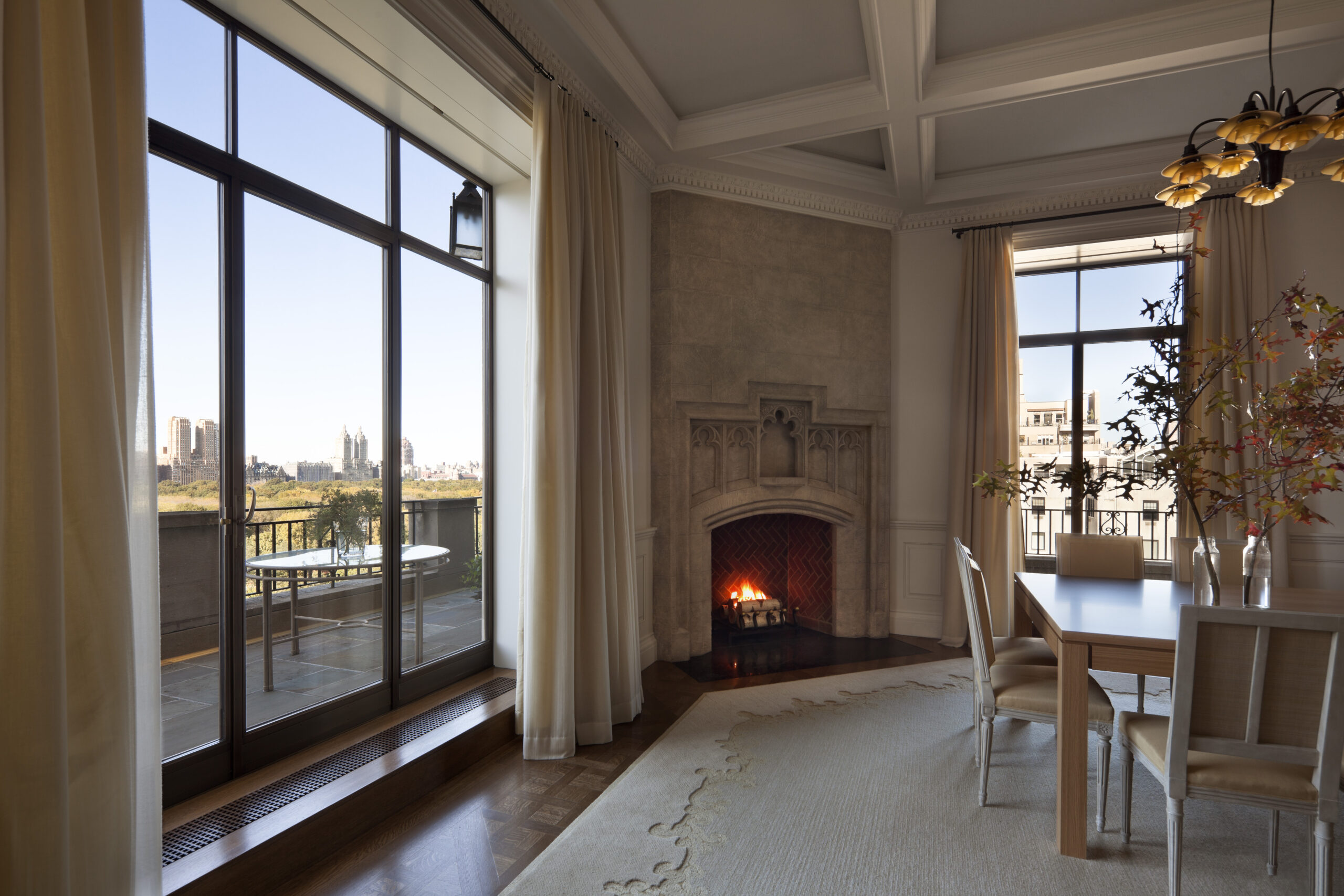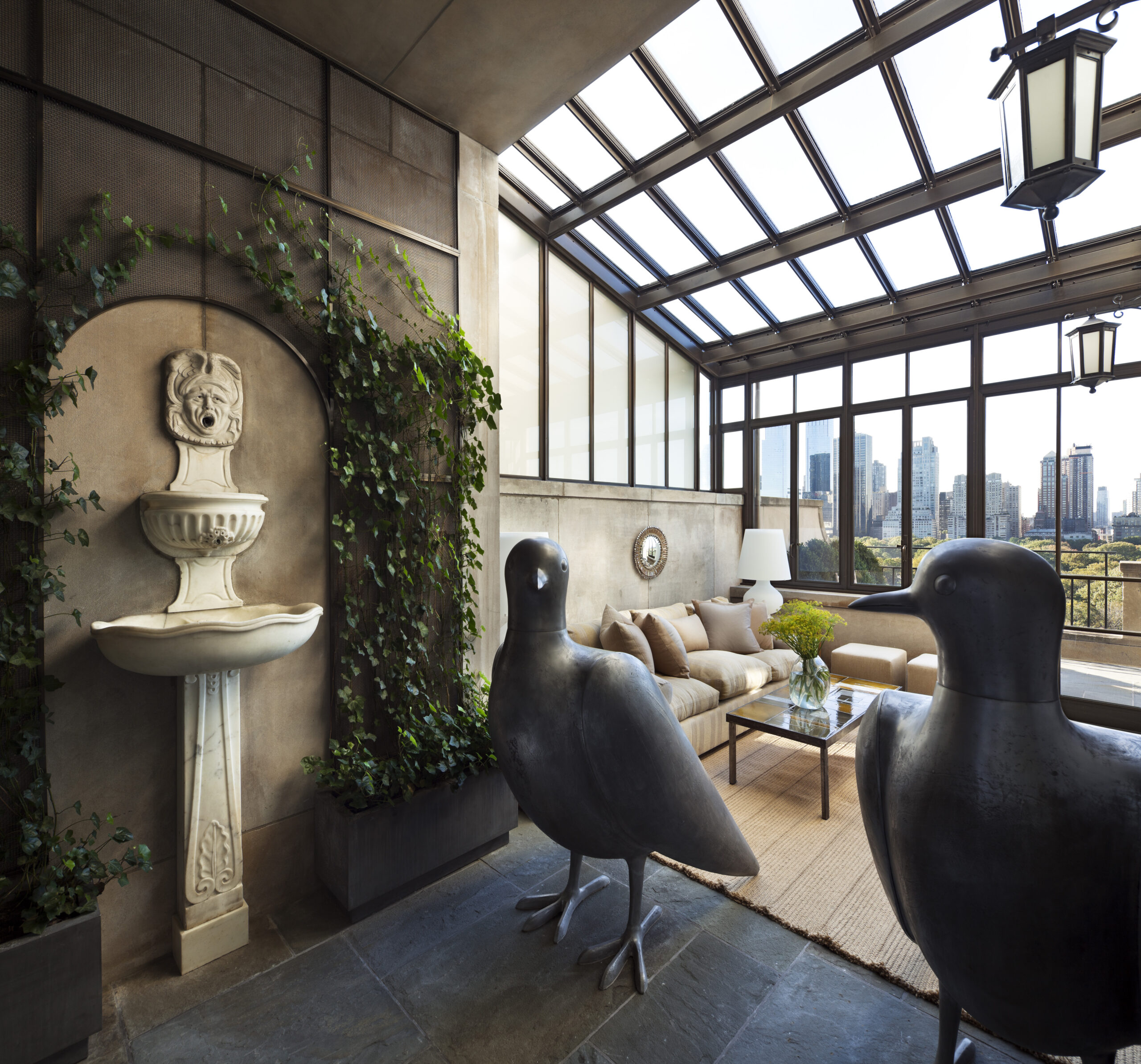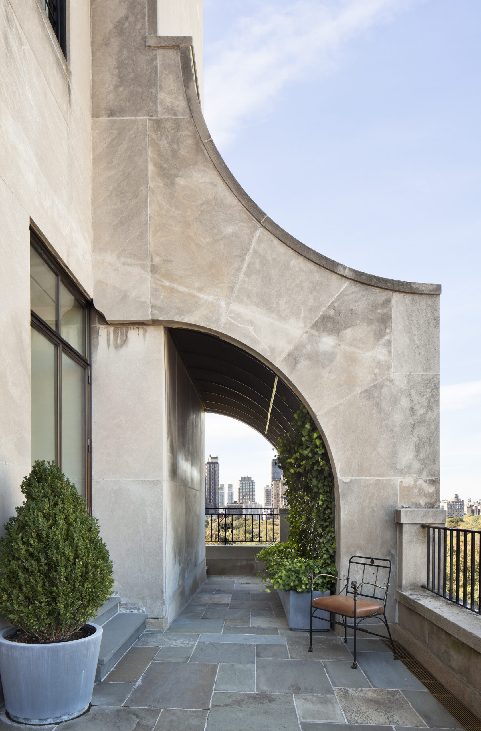 The old St. Charles metal kitchen cabinets are moved, recycled, and integrated into the new 25 square foot Bulthaup kitchen. The terraces spaces are joined through a new bronze clad opening and a former solarium is restructured with internally placed ivy to embrace the silhouette of the original buildings form.