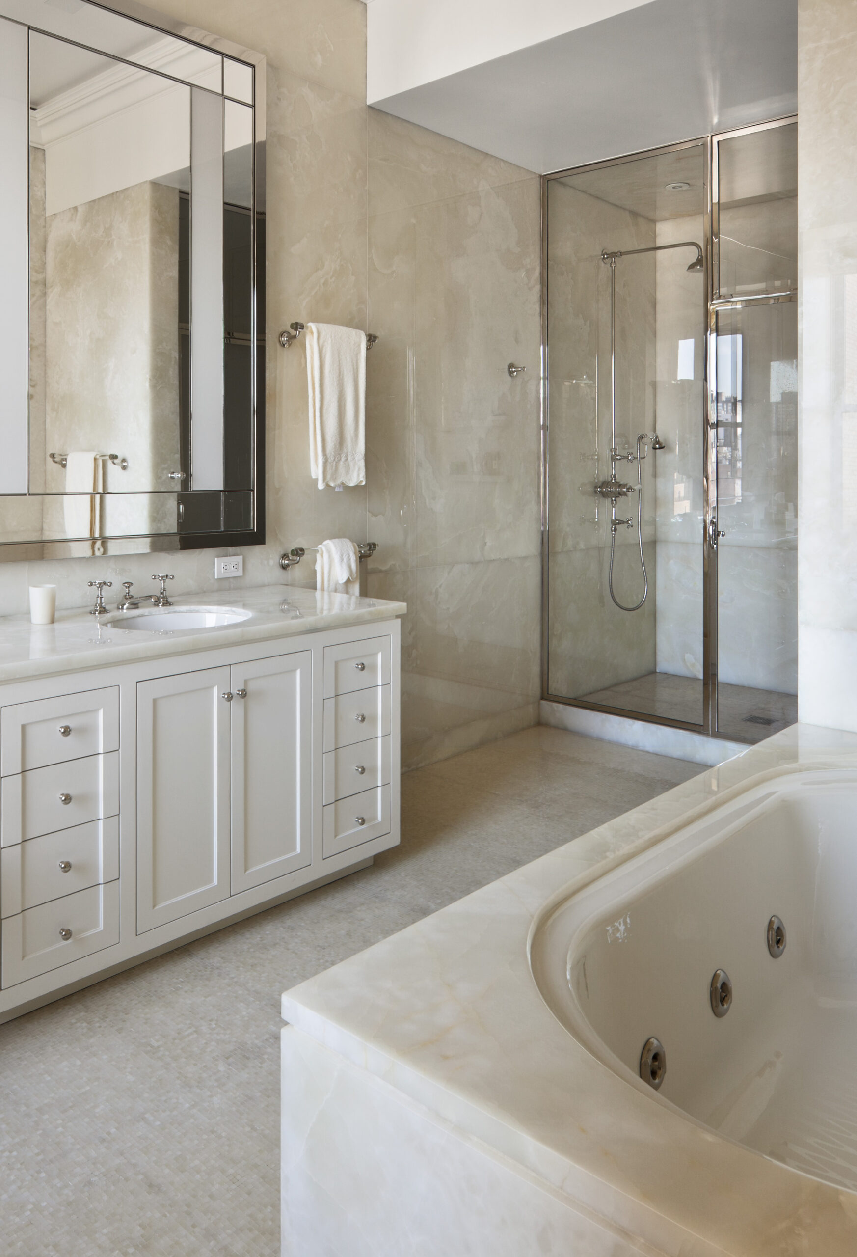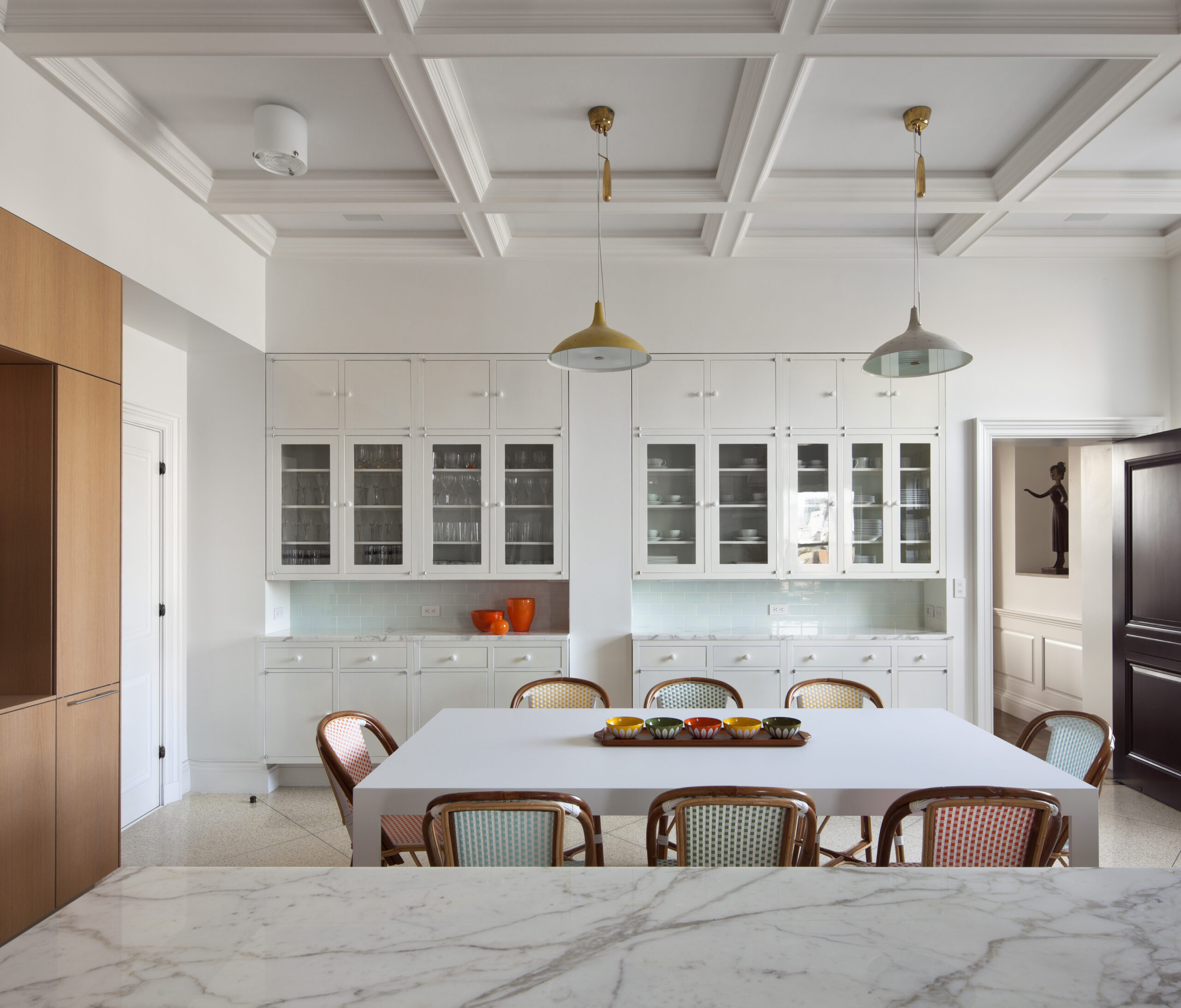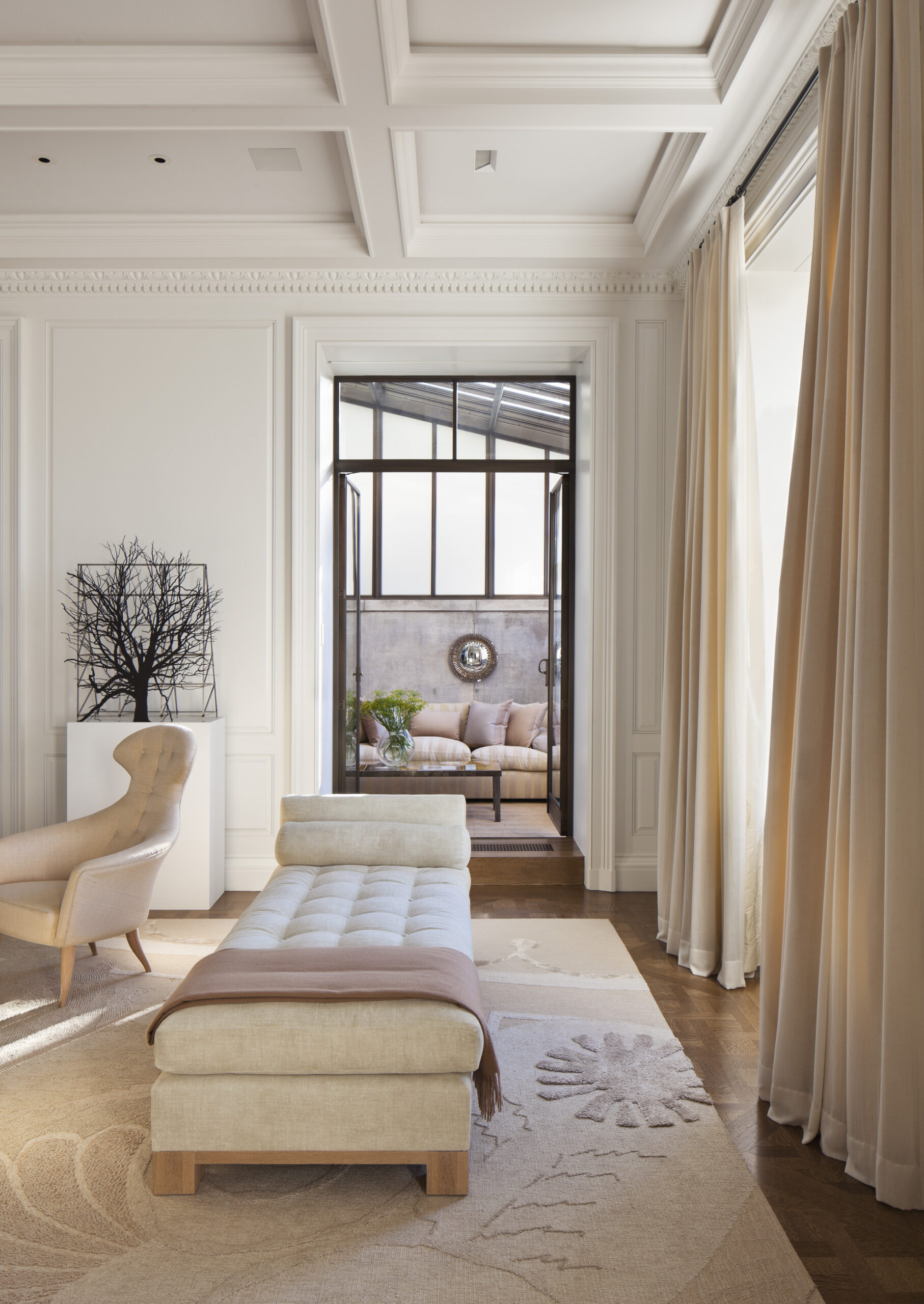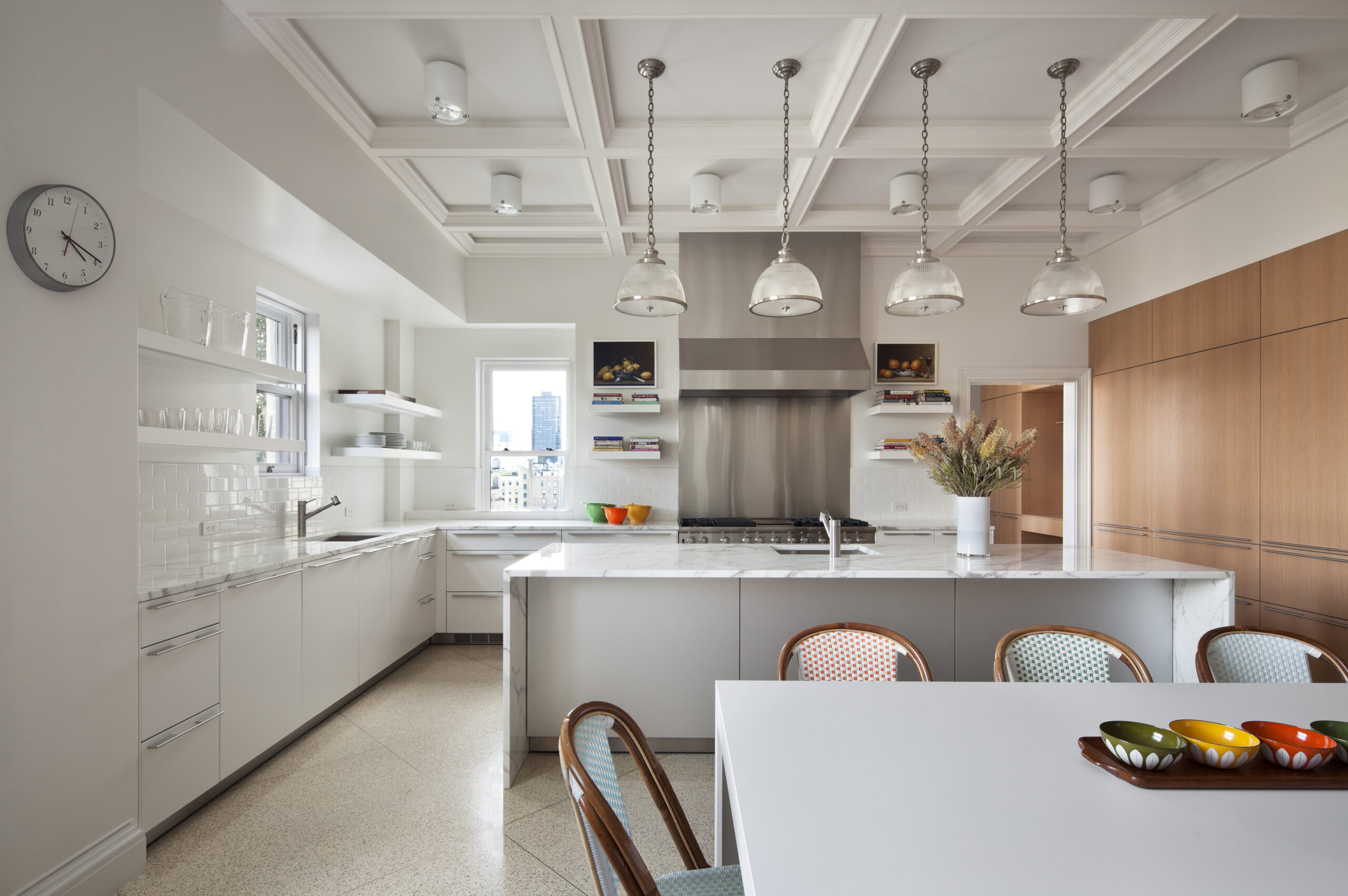 The old St. Charles metal kitchen cabinets are moved, recycled, and integrated into the new 25 square foot Bulthaup kitchen. The terraces spaces are joined through a new bronze clad opening and a former solarium is restructured with internally placed ivy to embrace the silhouette of the original buildings form.
