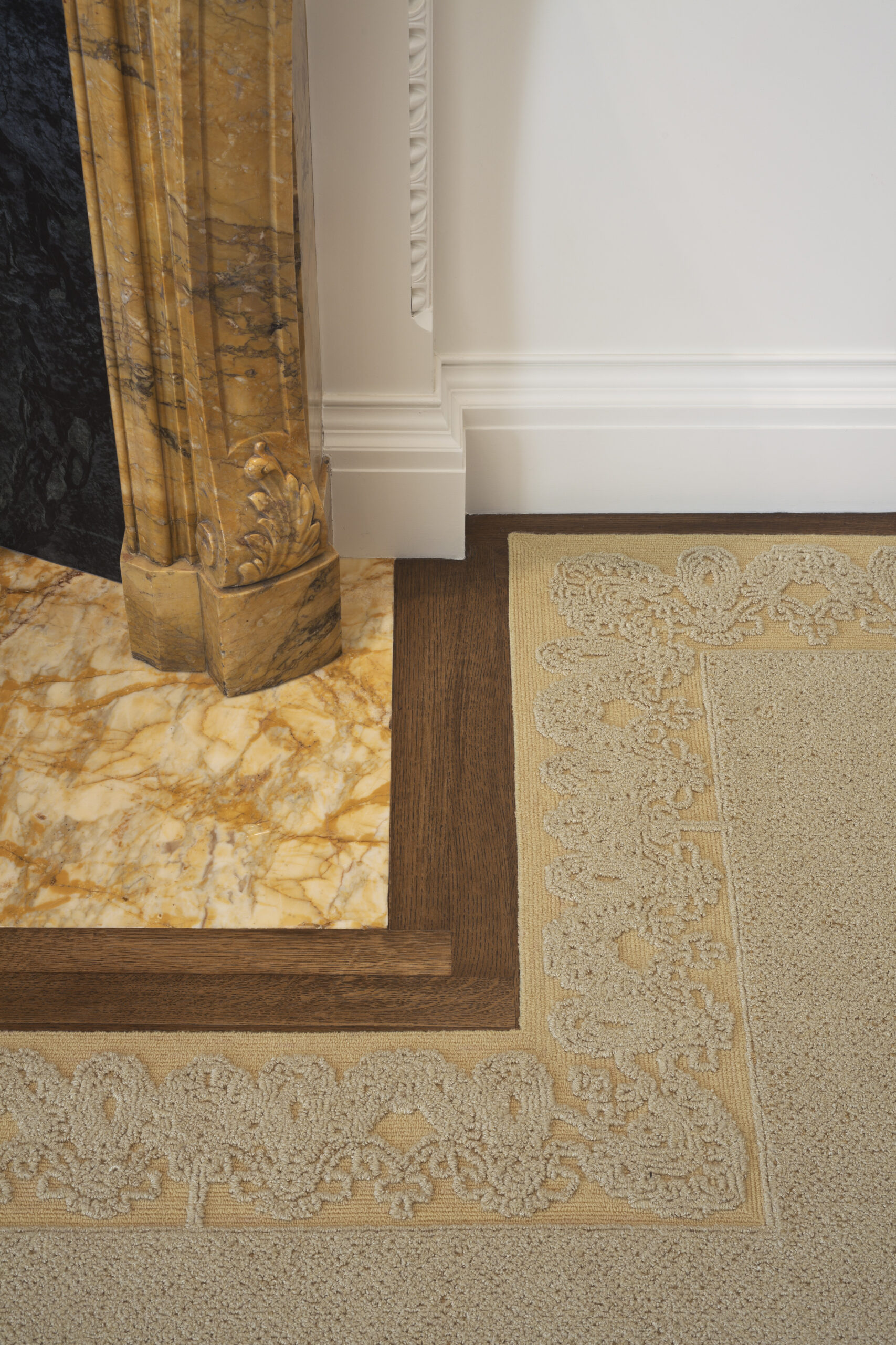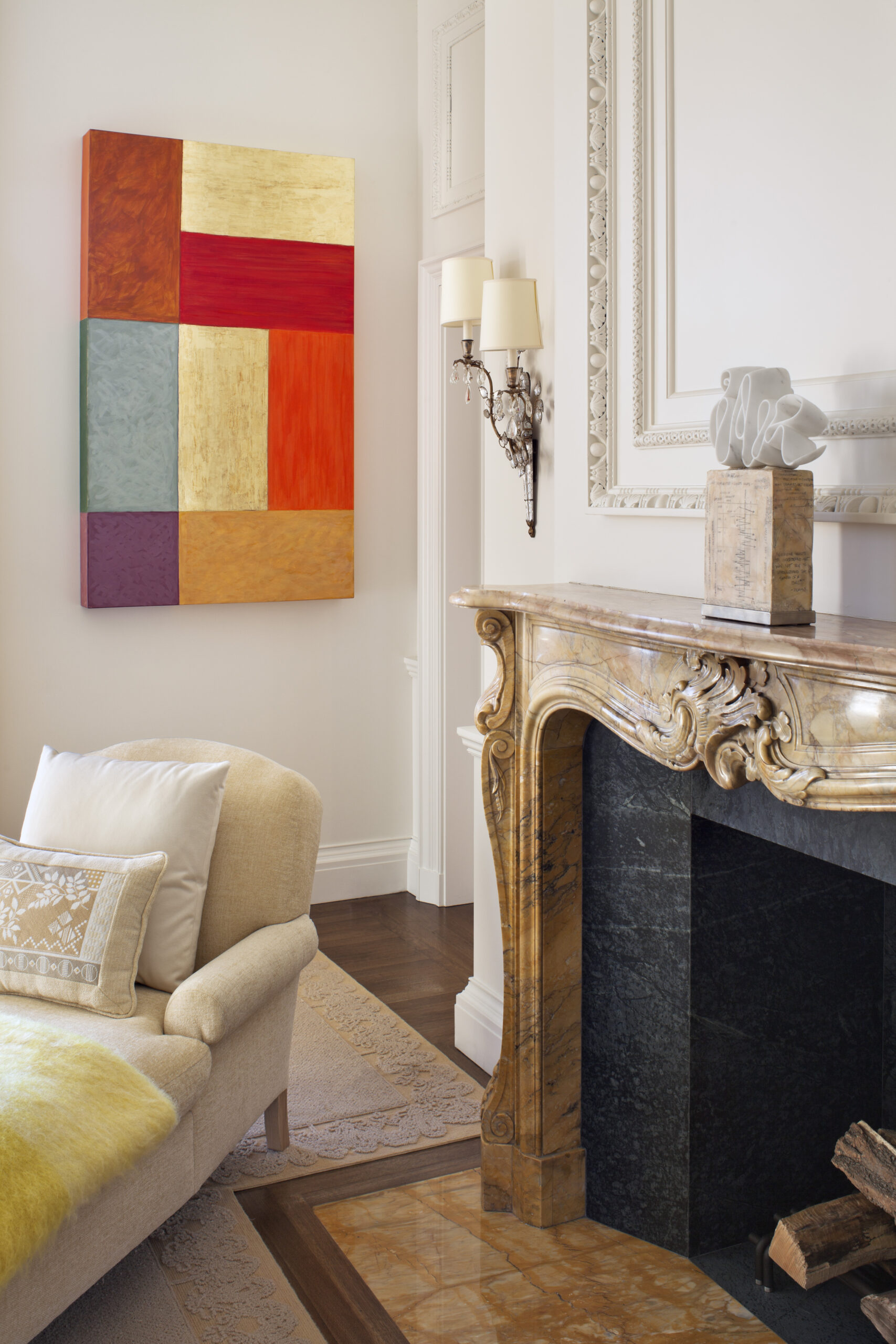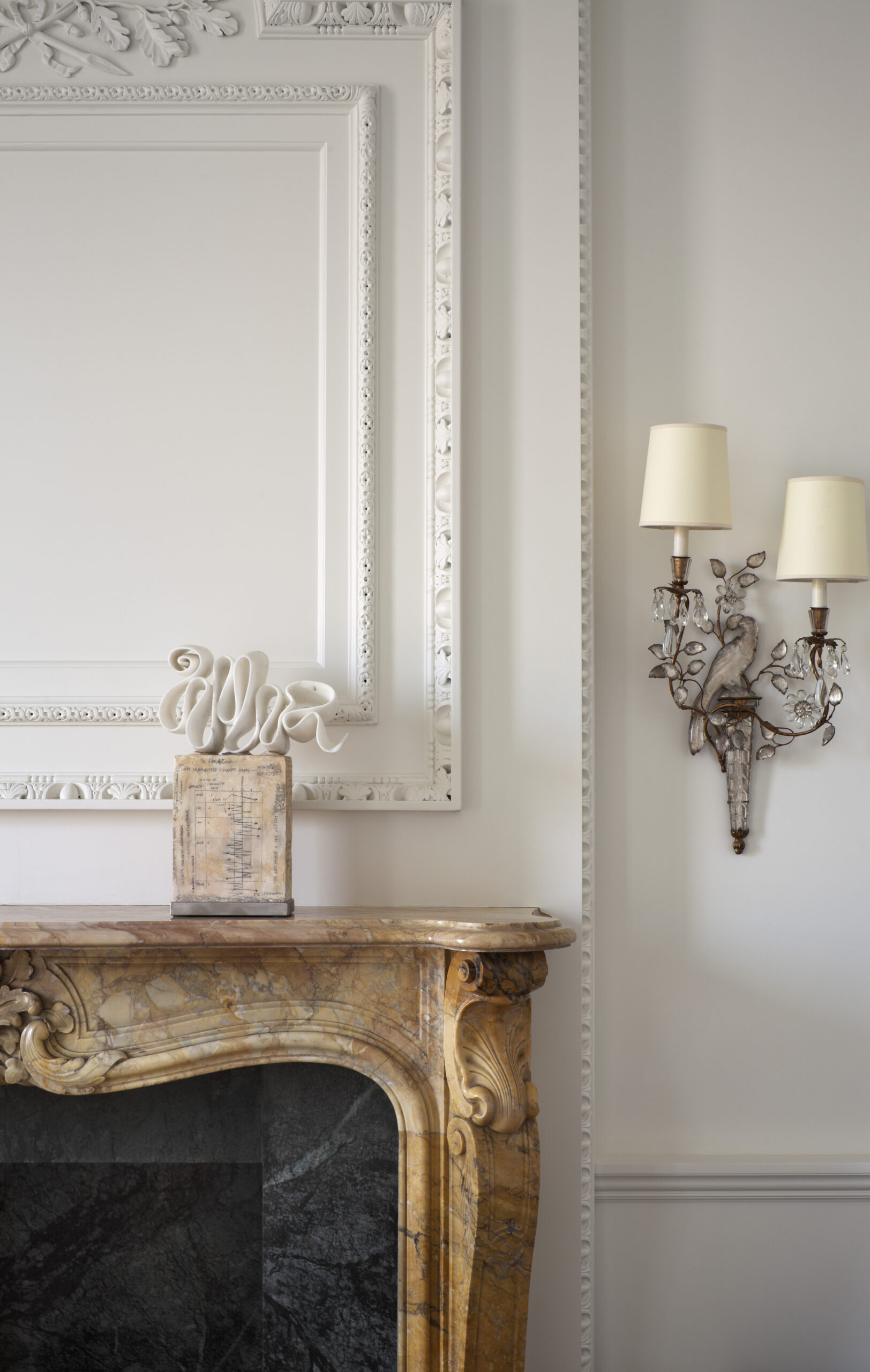 Raised gilded paneling form the former living room, which made it impossible to hang art is removed from its original living room; cut, pasted, plastered and used as cake frosting ornament in secondary spaces. The former living room mantle is swapped with the former master bedroom mantle finding it more of an appropriate application.
