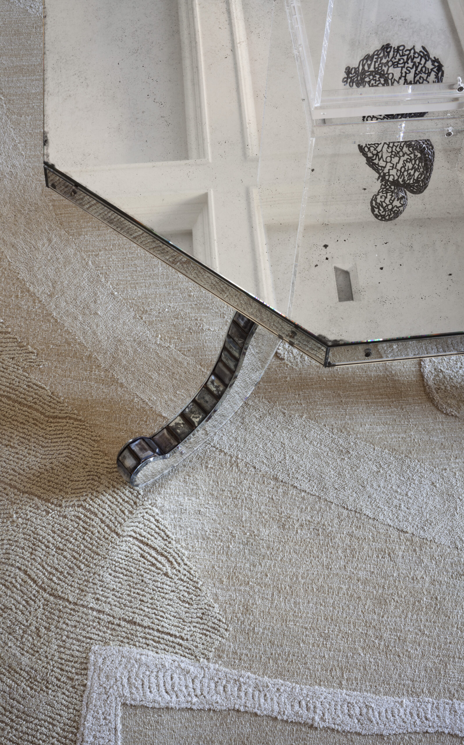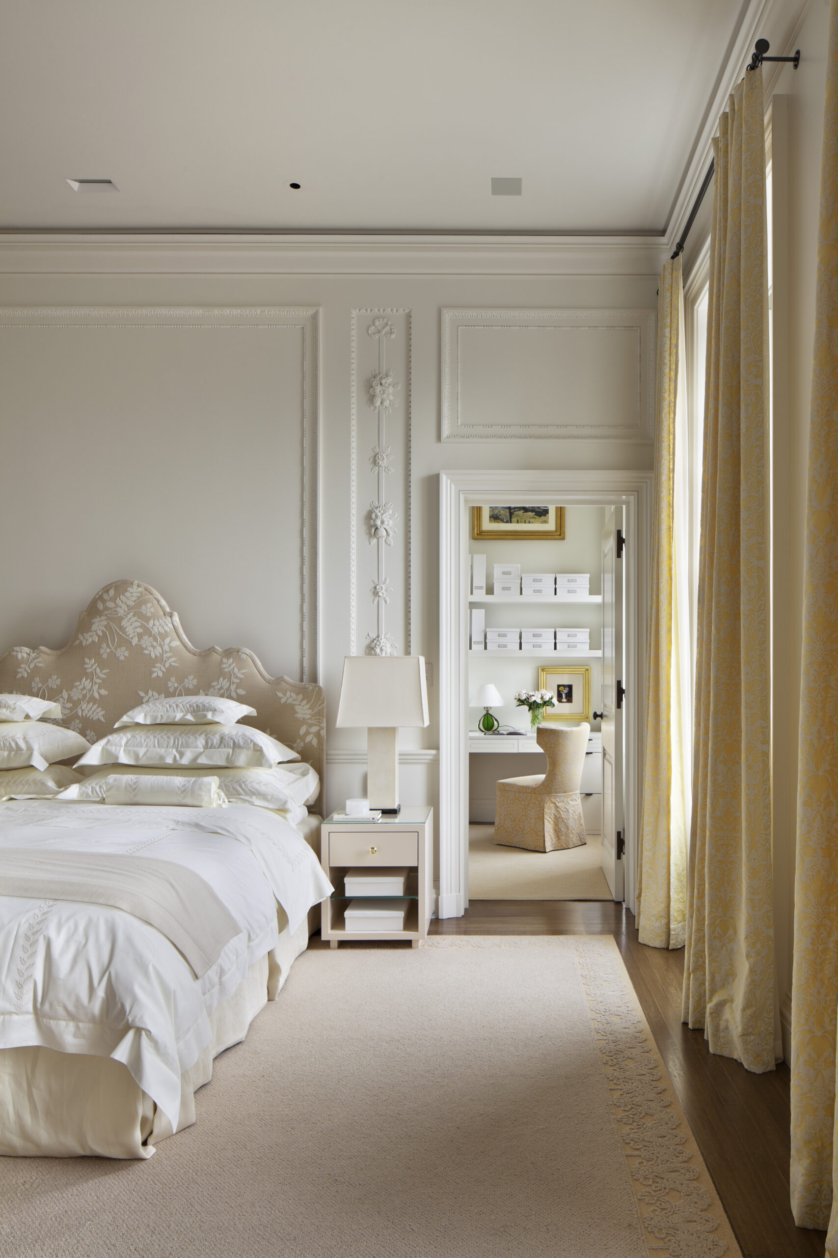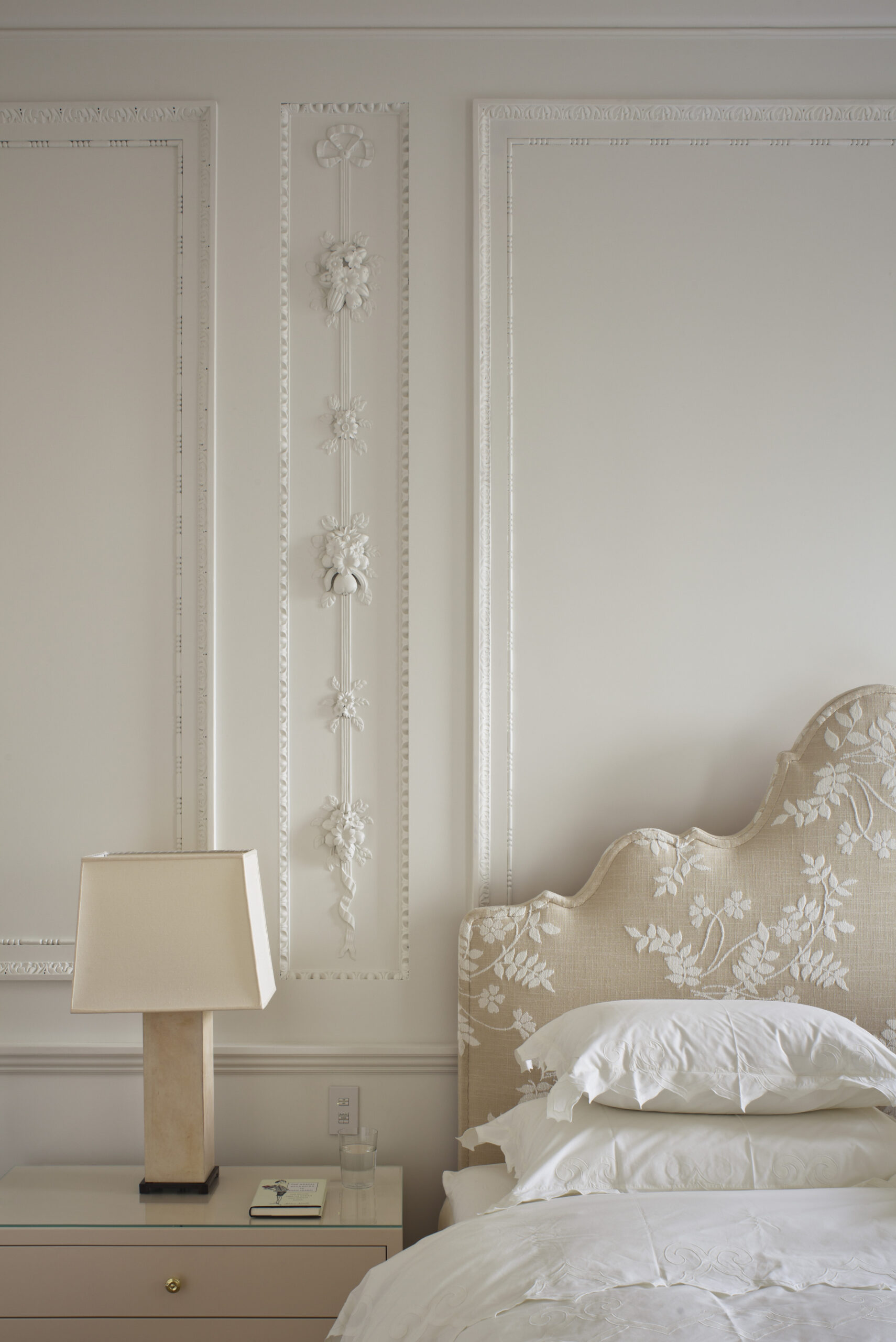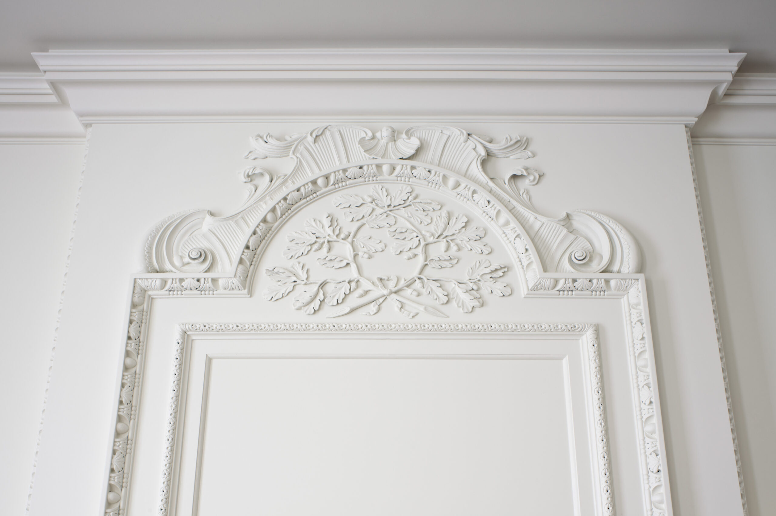 Raised gilded paneling form the former living room, which made it impossible to hang art is removed from its original living room; cut, pasted, plastered and used as cake frosting ornament in secondary spaces. The former living room mantle is swapped with the former master bedroom mantle finding it more of an appropriate application.