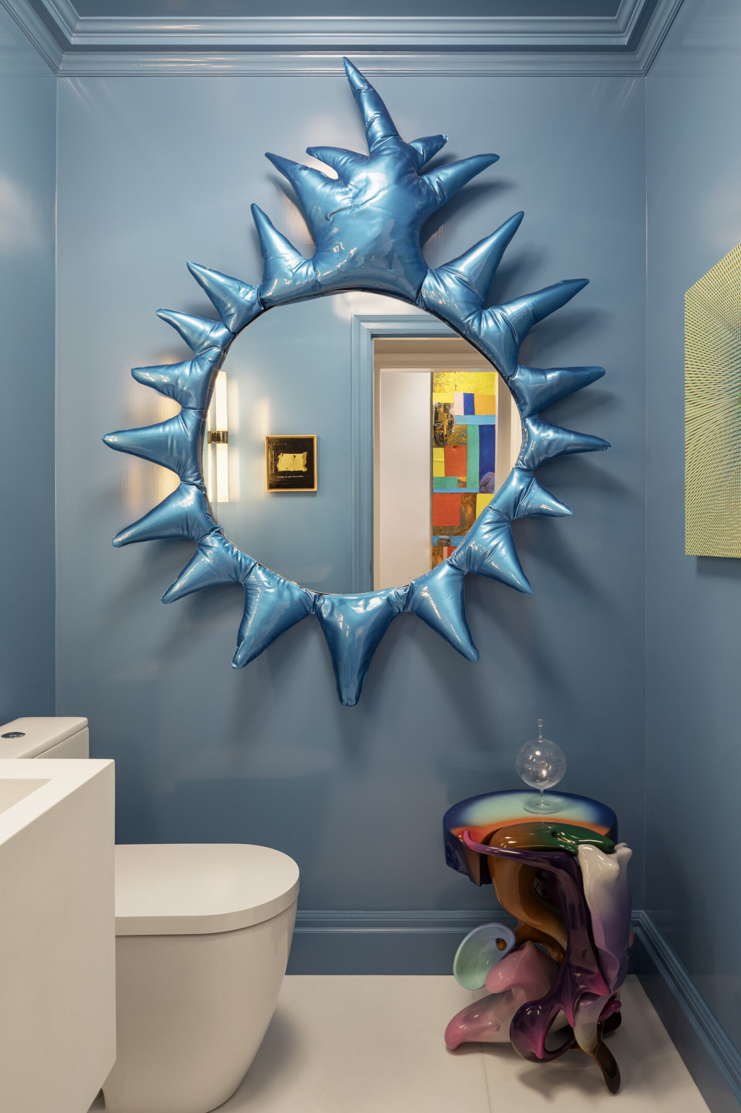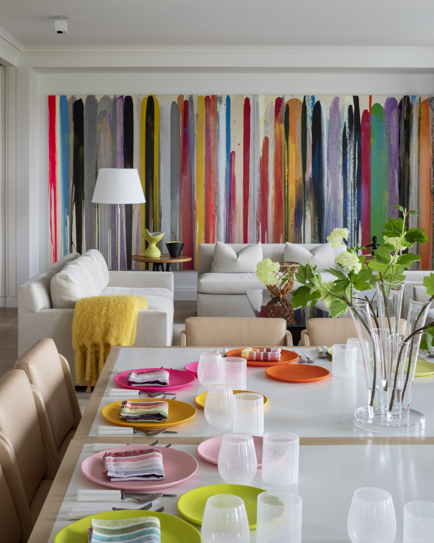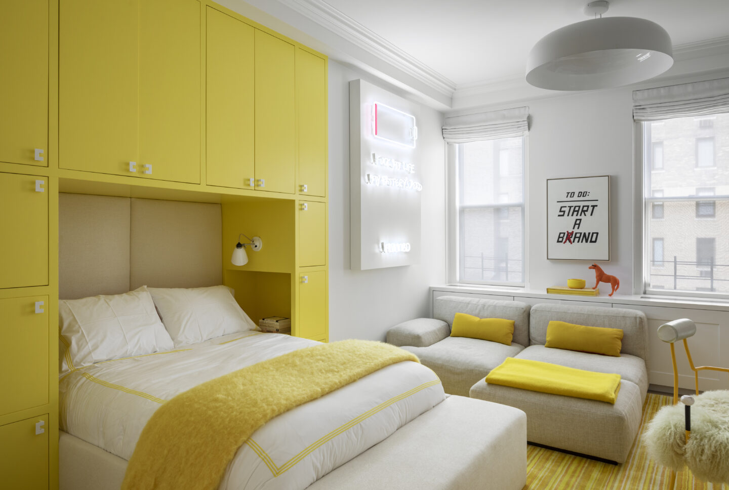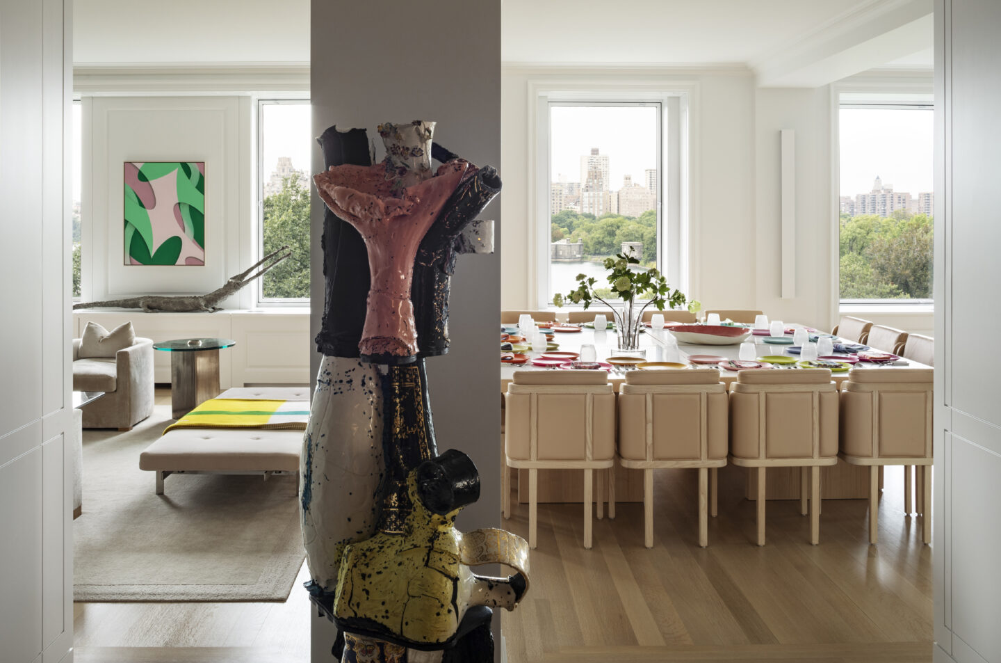 A continuous window wall expressed as a bay system integrates heating, ventilating, storage and a motorized window treatment unifies the living room, family room and dining room. Partitions between these public areas remain freestanding, and the wall itself becomes a clearly articulated element, which emphasizes and frames the views of the Reservoir, Central Park, and the George Washington Bridge. The space appears open and light is allowed to flow freely between the rooms.