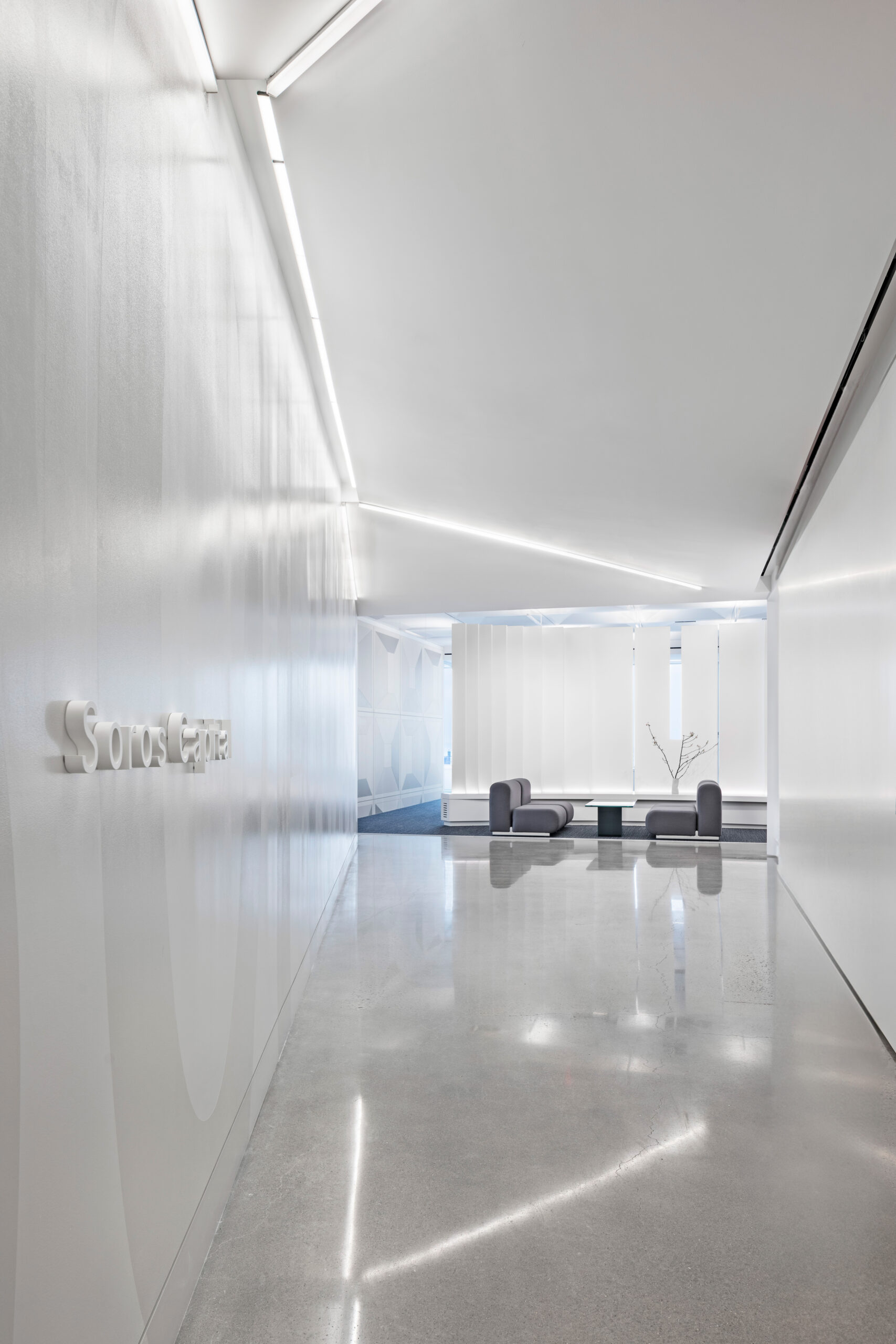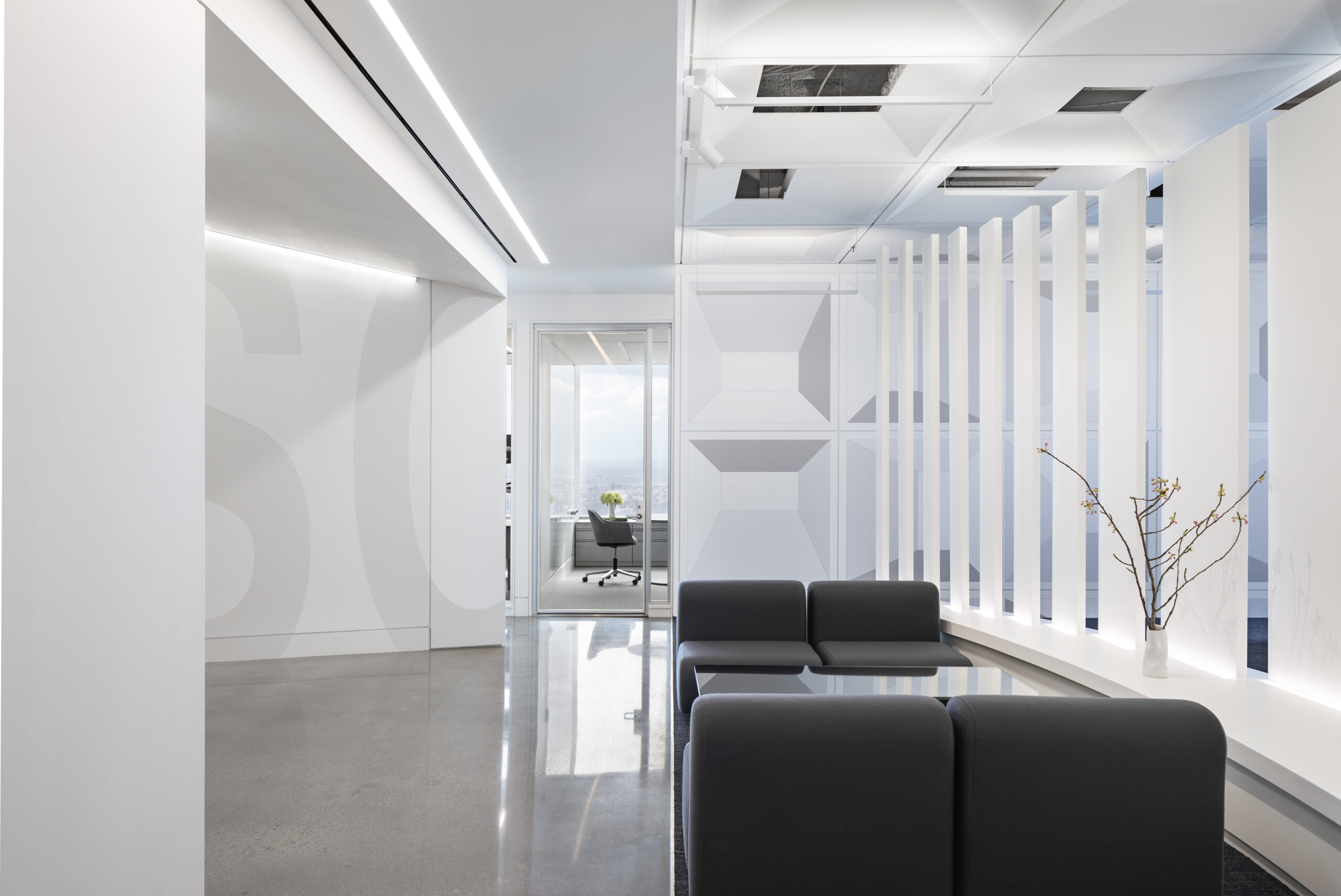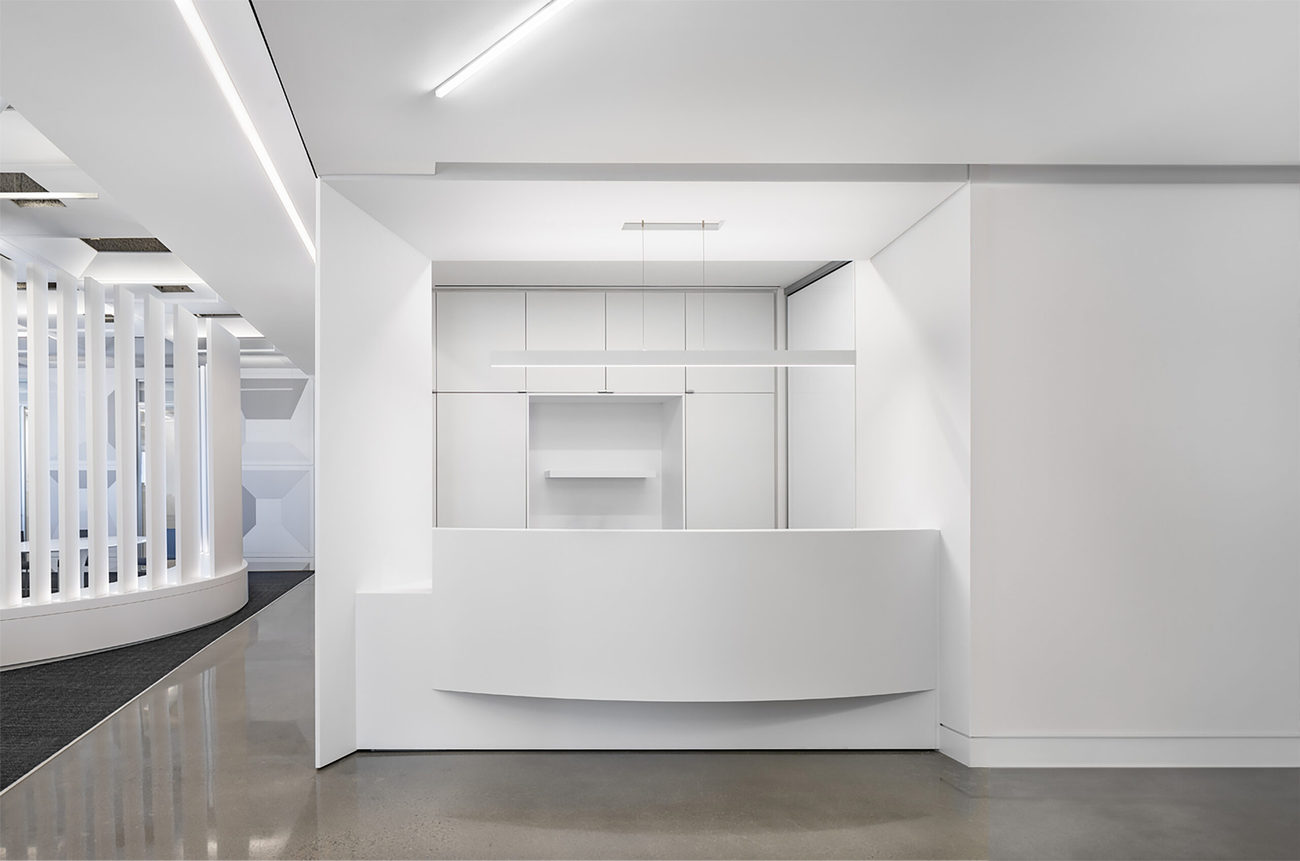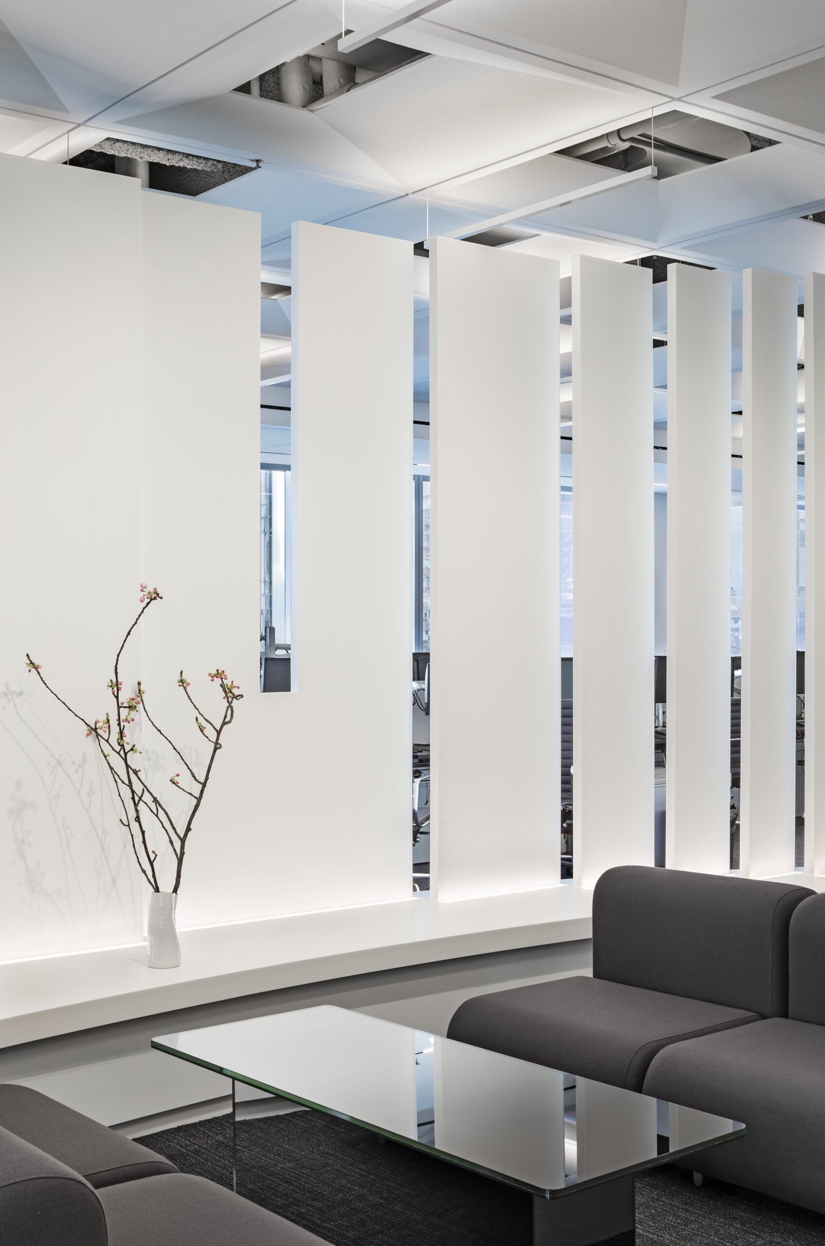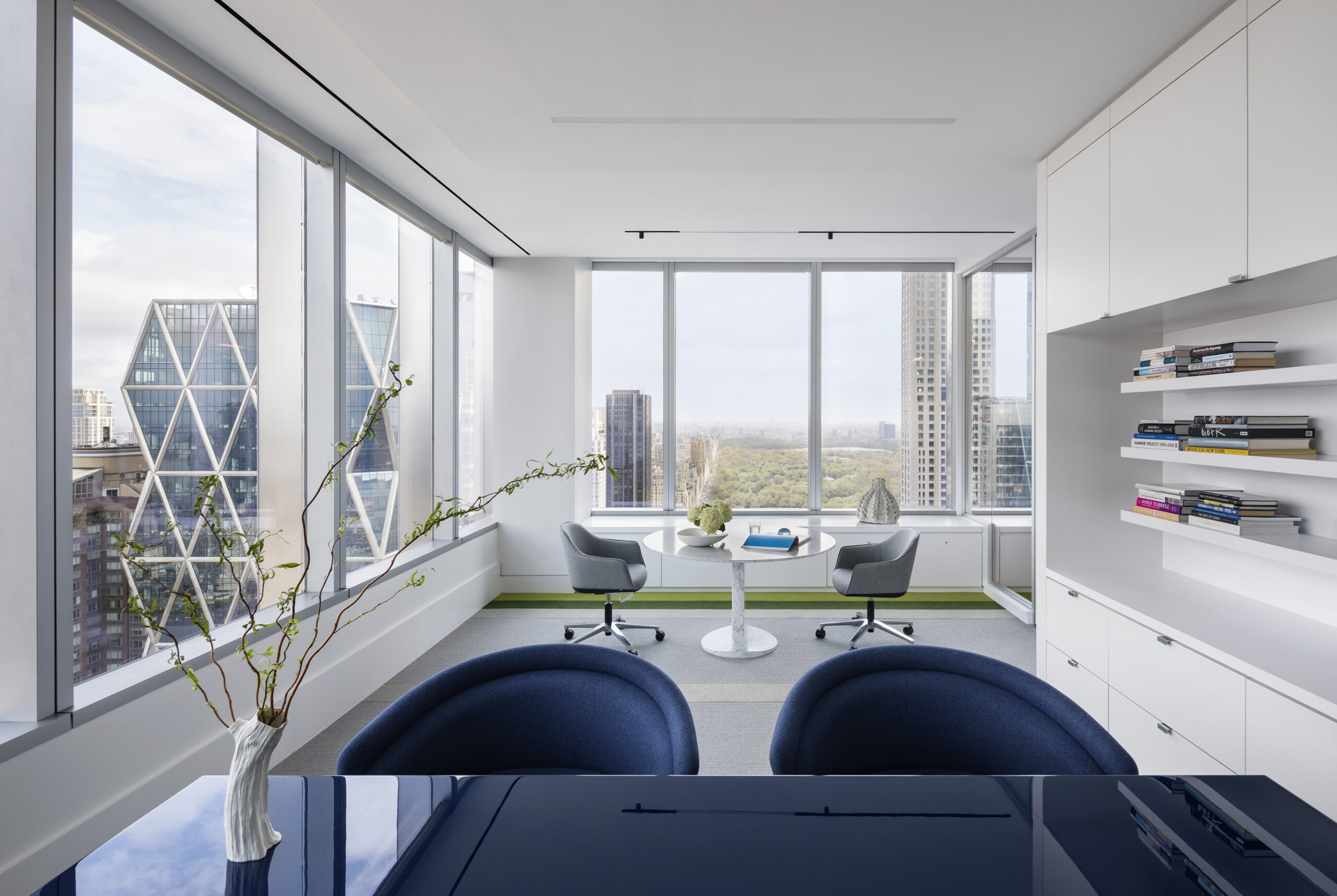 The entry sequence, forced perspective, open central space, and sharp angles create long vistas across the widest dimensions of the office, bringing light and visual access to the city and Central Park into all parts of the space, making them available to all members of the organization.