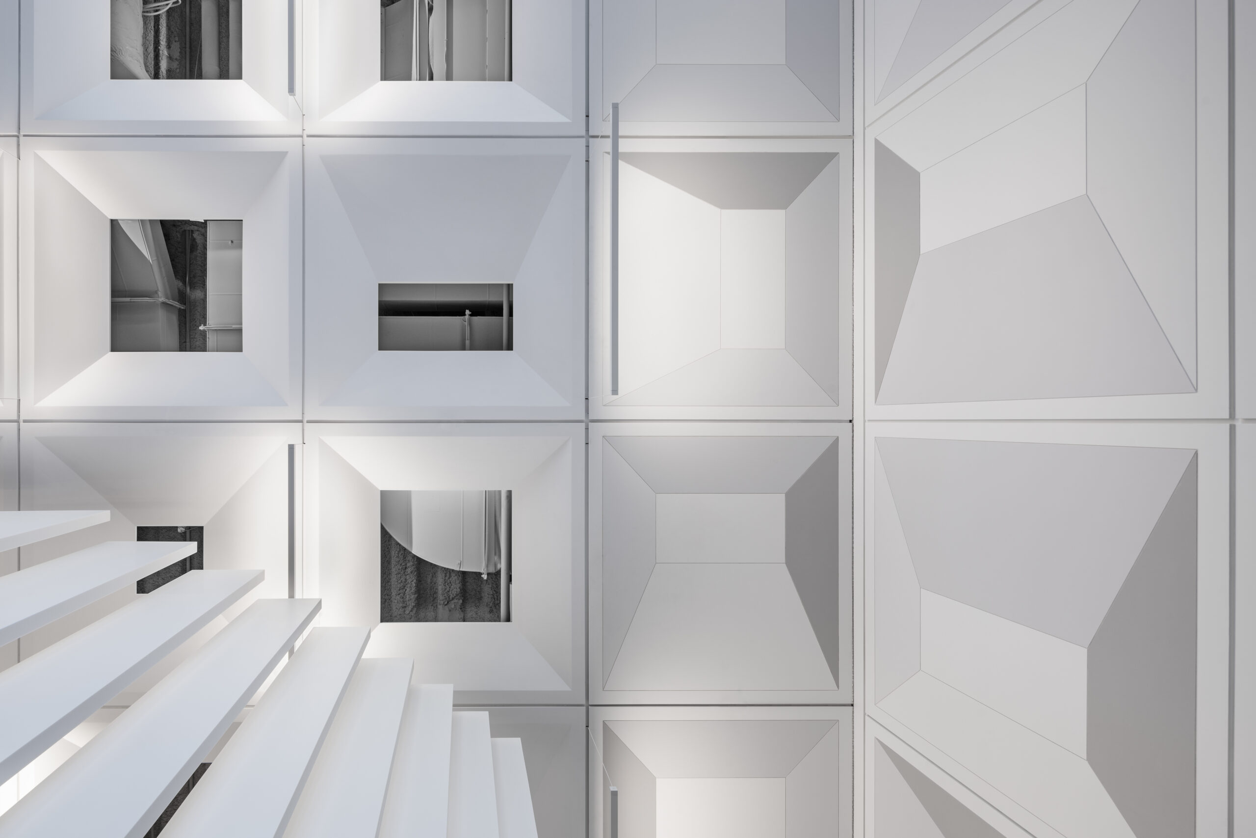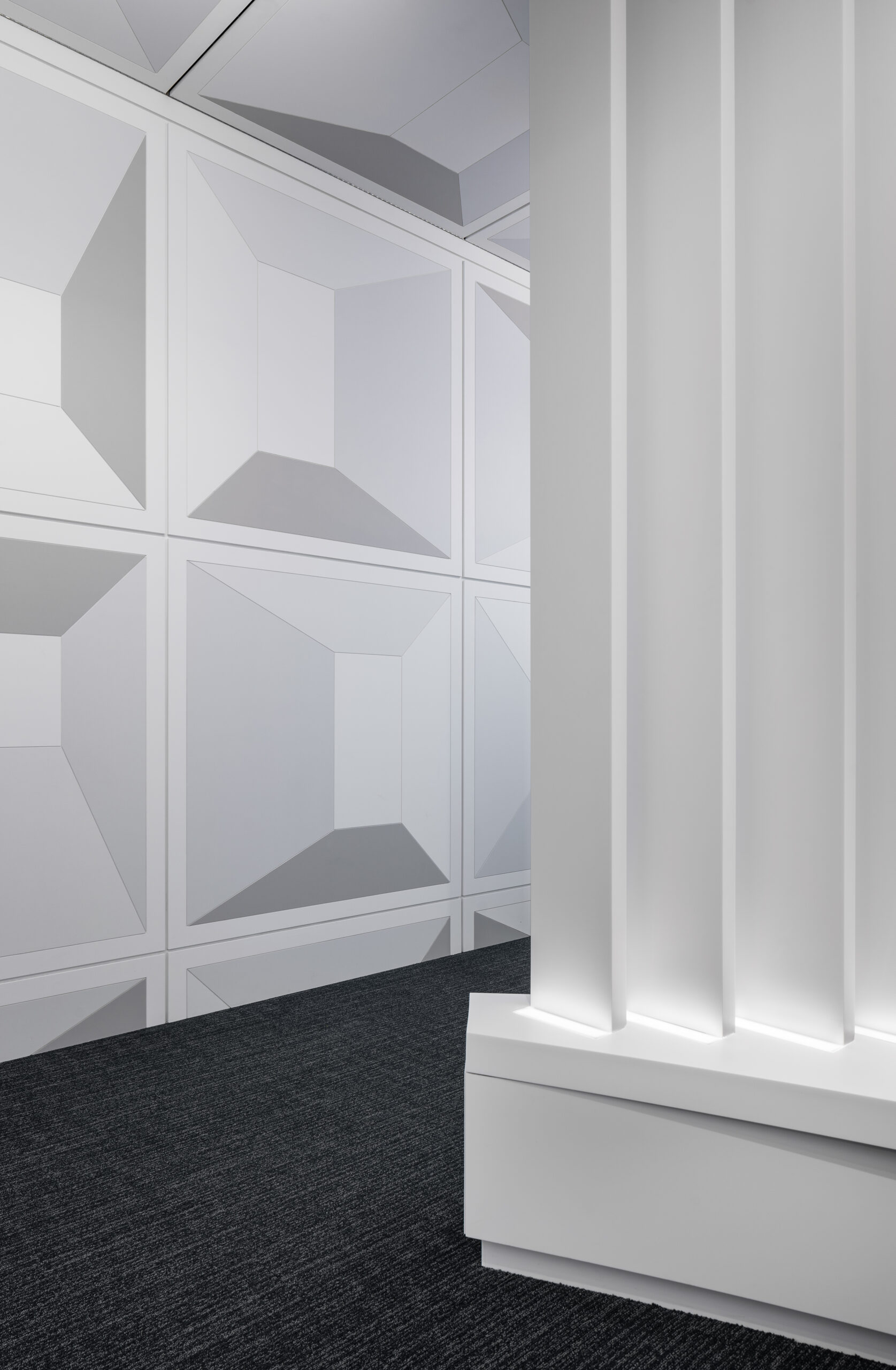 Above the ceiling of the main trading space, a three dimensional grid of angled planes with different sized apertures repeat in a turned pattern providing baffled light. The openings allow one to feel the full twelve foot ceiling height fully expressing the shell of the space.