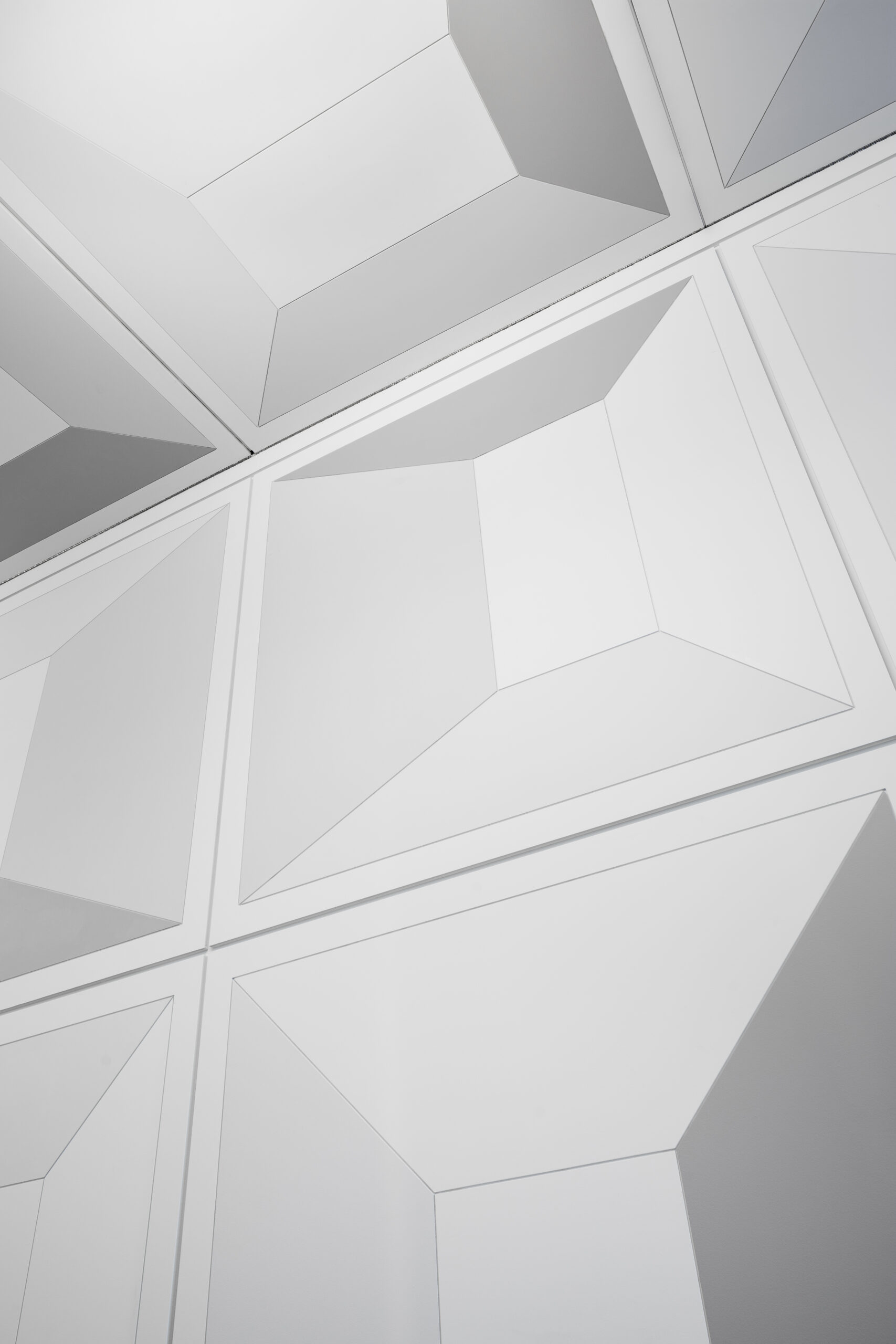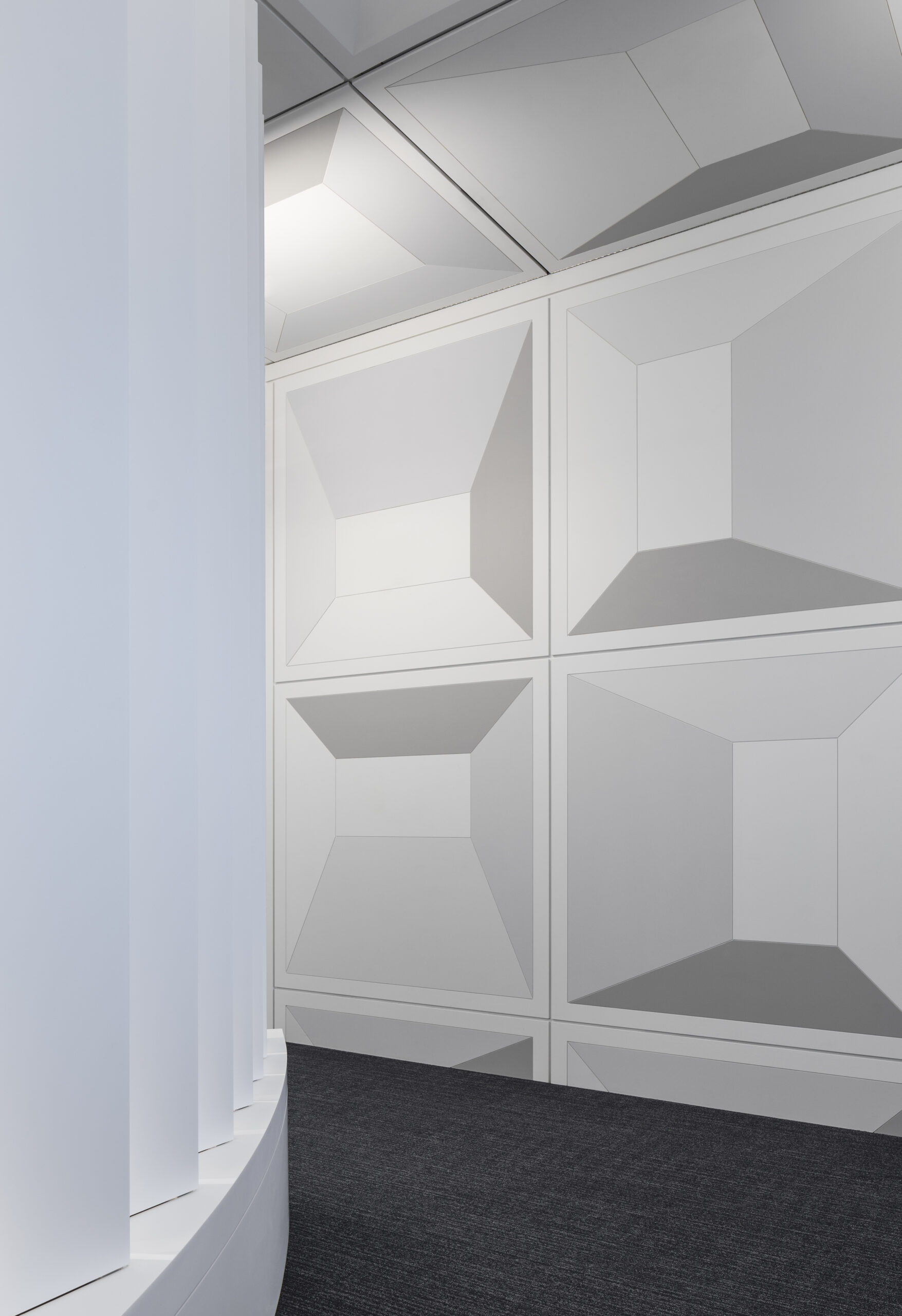 At both ends of this gridded plenum, the square panels turn down from the ceiling to the wall to complete a U-shaped enclosure. To simulate depth on the wall panels, a trompe l’oeil is employed through the uneven shading of panel facets, reminiscent of the chiaroscuro on the ceiling panels.