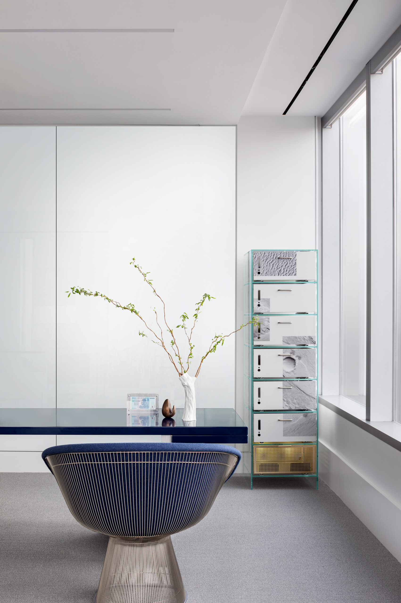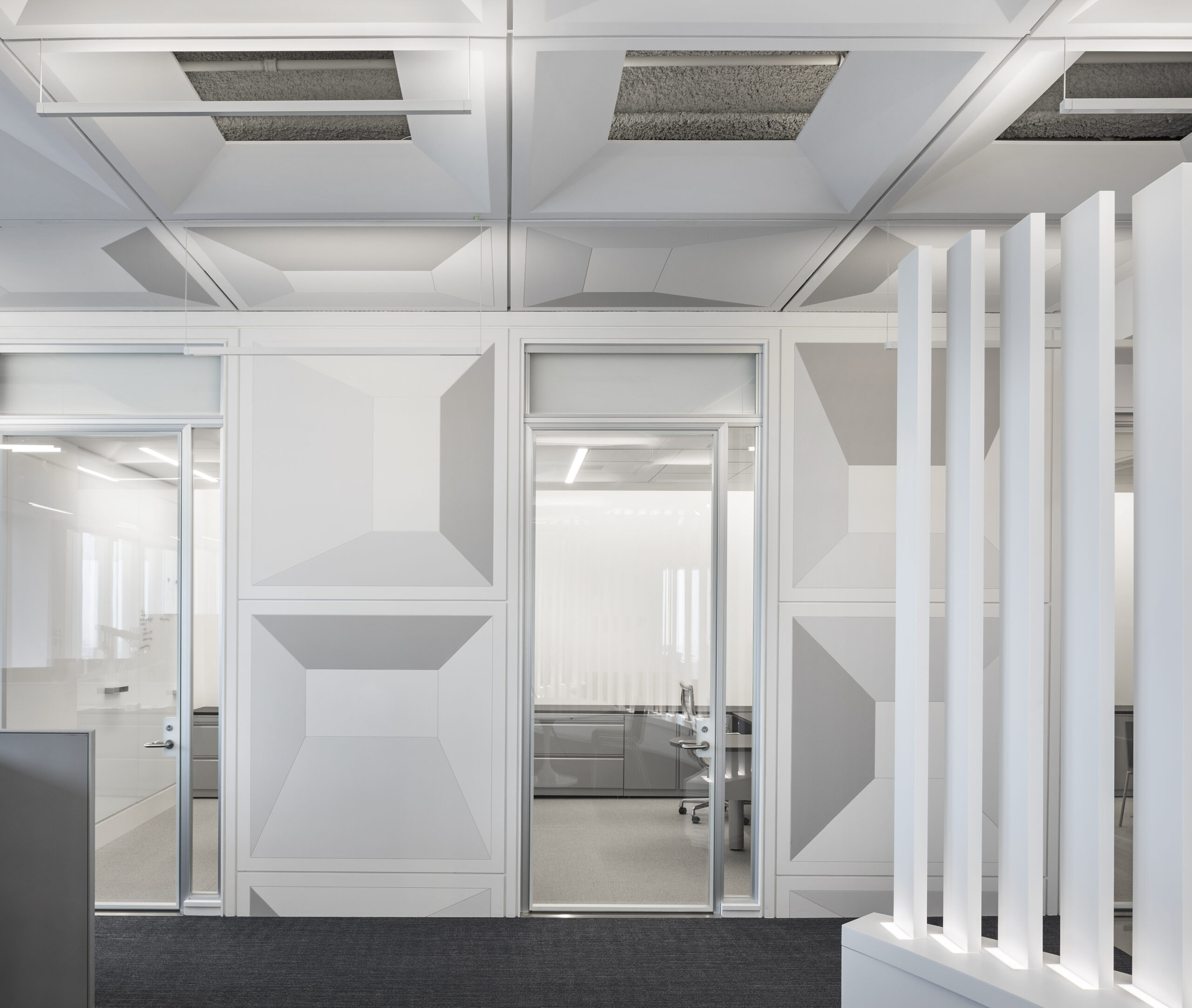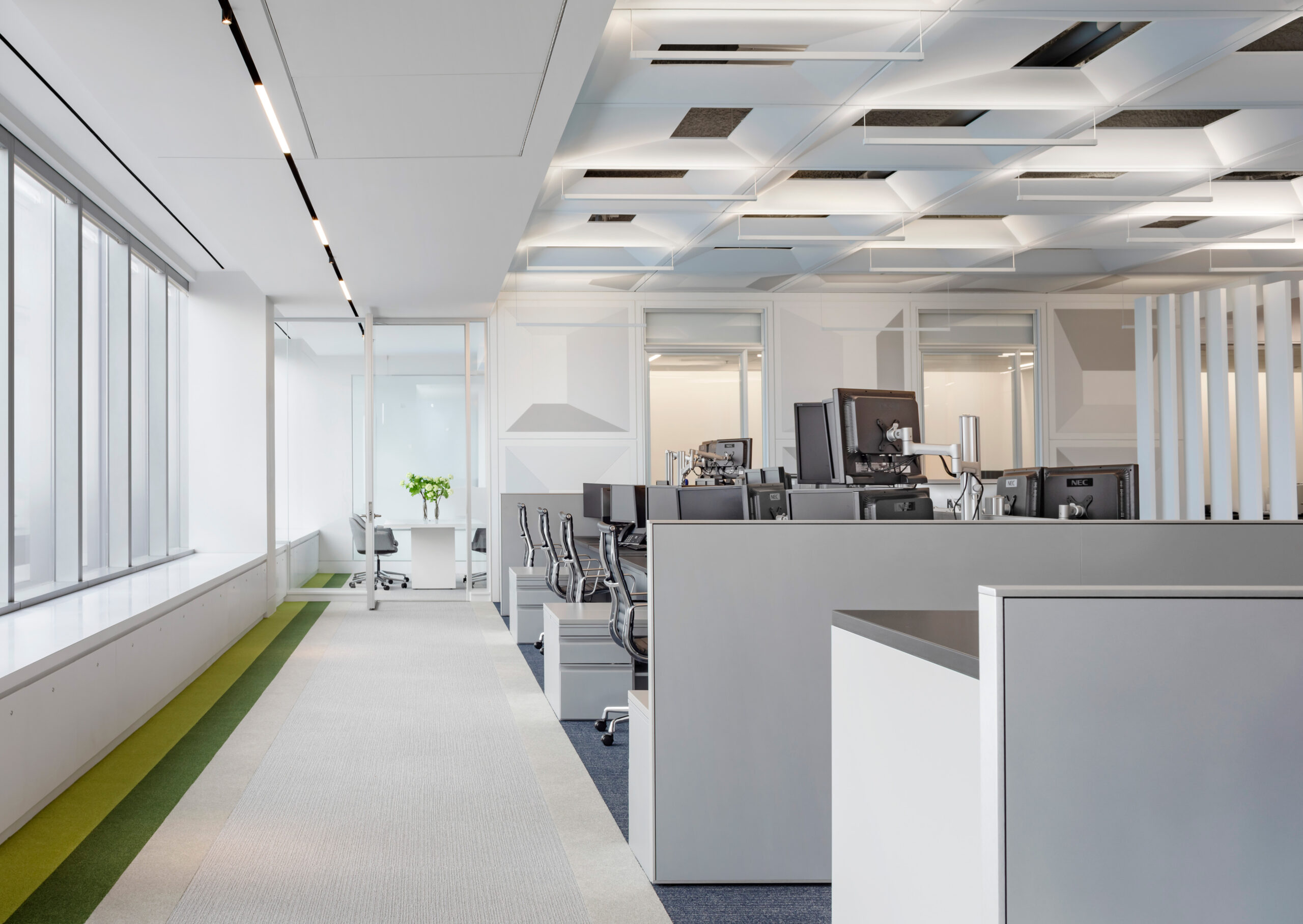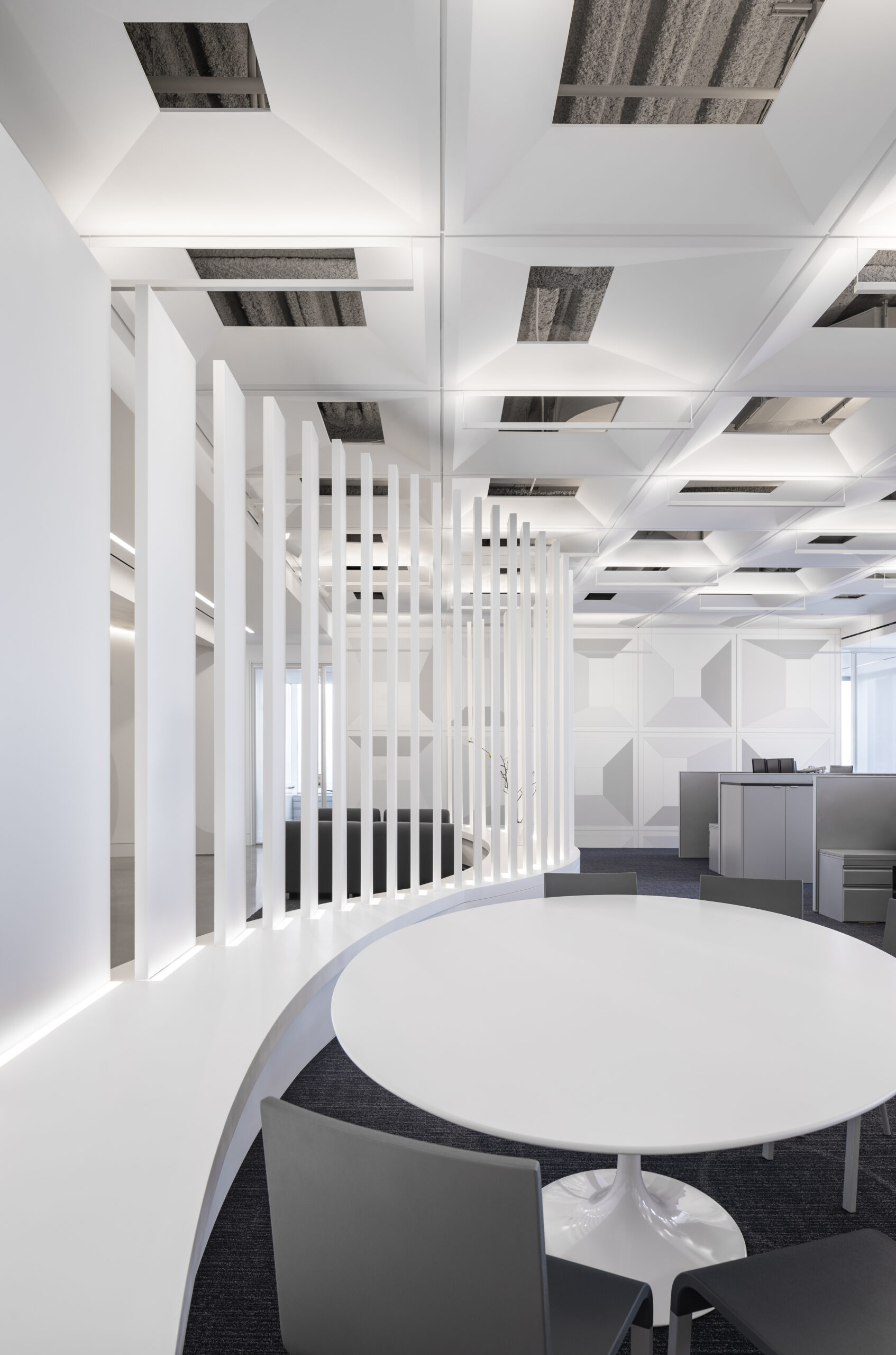 The private offices and meeting rooms surround the open trading floor and are enclosed with a curtain wall system. The private rooms are lined with what appears to be opaque white glass, reflecting images of the city into the spaces, but are in fact, magnetic writable wall surfaces.
