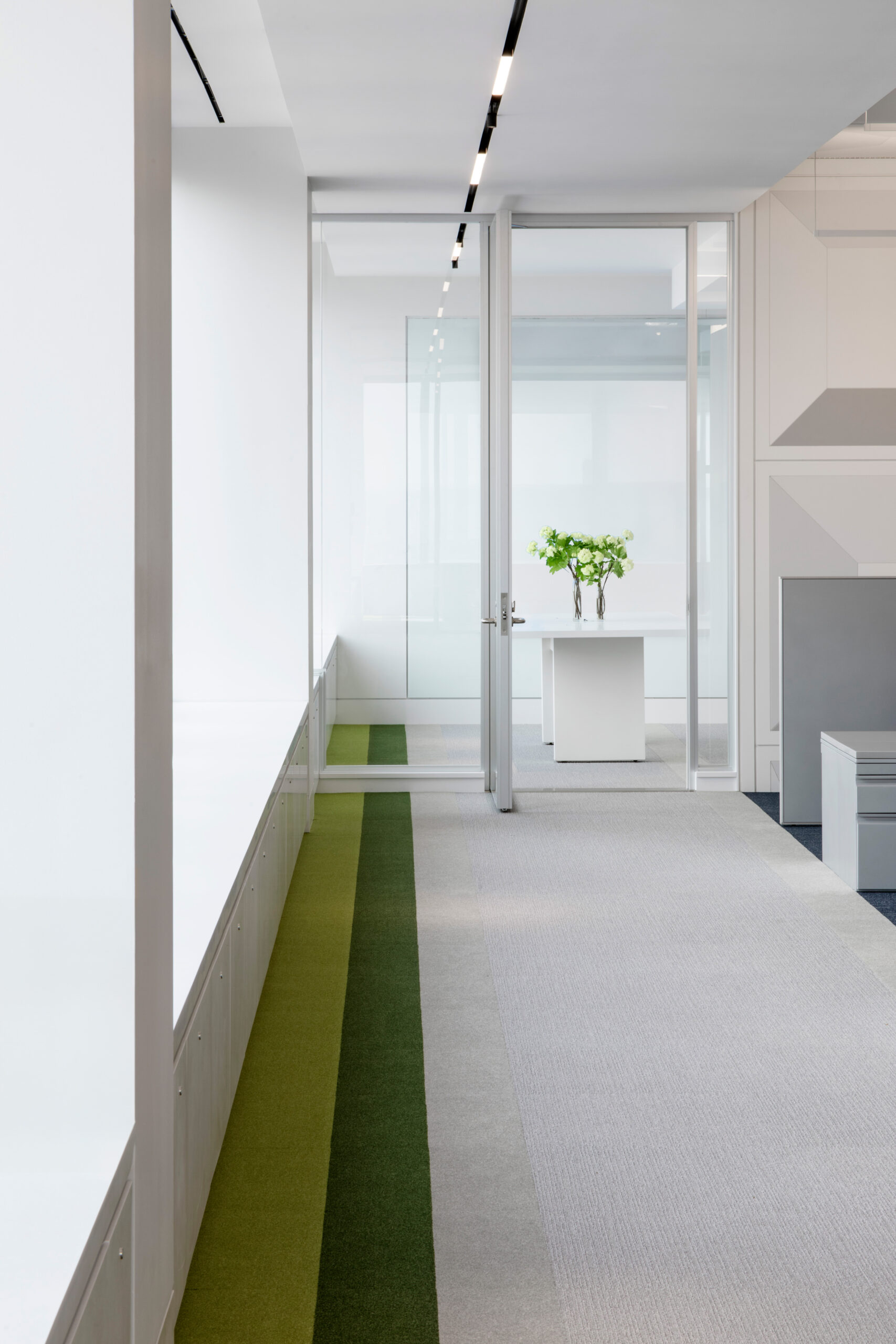 Creating a unique entry to this 5,000 square foot capital management office posed a challenge as it shares a floor with three other companies. A clear path into the space was created with a forced perspective, in the shape of a trapezoid, which funnels people from an interior access point into the space, culminating with an expansive view of Central Park. A series of vertical white lit planes, following an S-curve, separate the public reception and circulation from the trading spaces. A continuous bench stretches the full length of the park exposure, ending at the chairman’s office to the west and a conference room to the east. A graphic green belt expressed in the carpet brings the greenery from the park into the office.